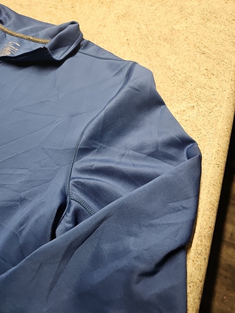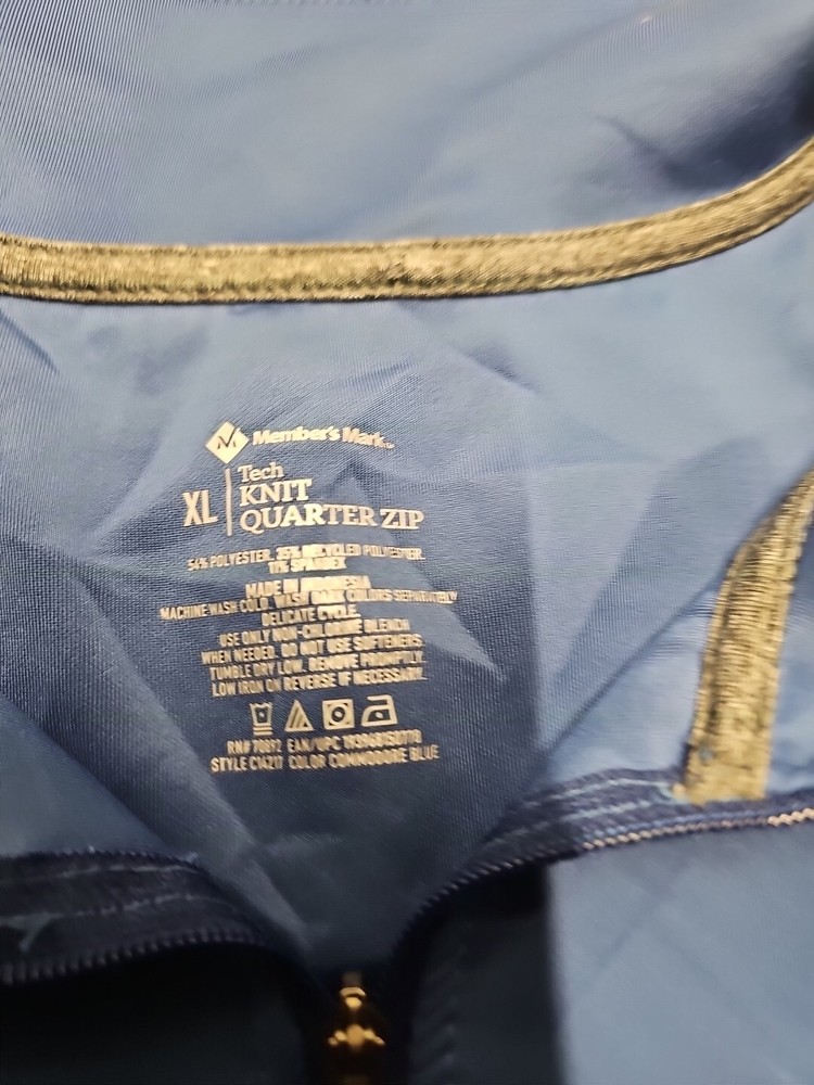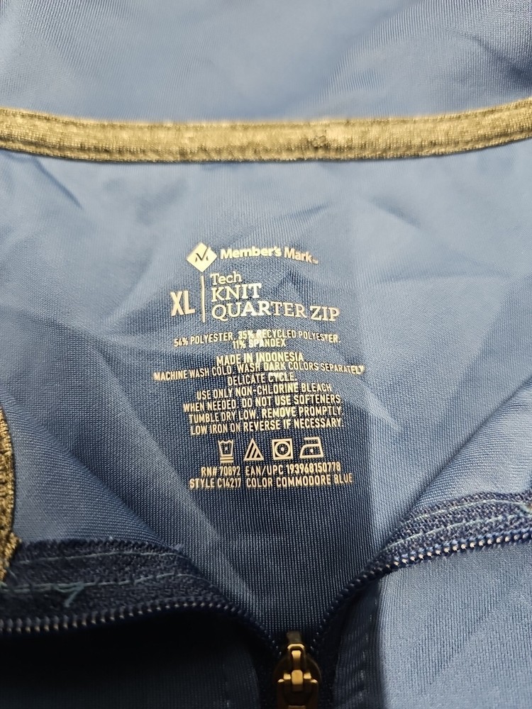 Material: Polyester, Spandex Occasion: Activewear Department: Men Features: 1/4 Zip Performance/Activity: Casual Color: Blue Brand: Member's Mark Fabric Type: Microfiber Closure: Pullover Size: XL Fit: Regular Country/Region of Manufacture: Indonesia Product Line: Members Mark Neckline: Collared Vintage: No Character: None Sleeve Length: Long Sleeve Style: Pullover Type: Casual Pattern: Solid Size Type: Regular