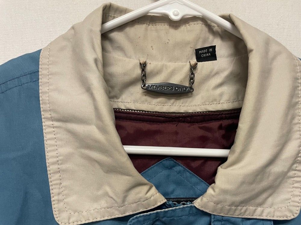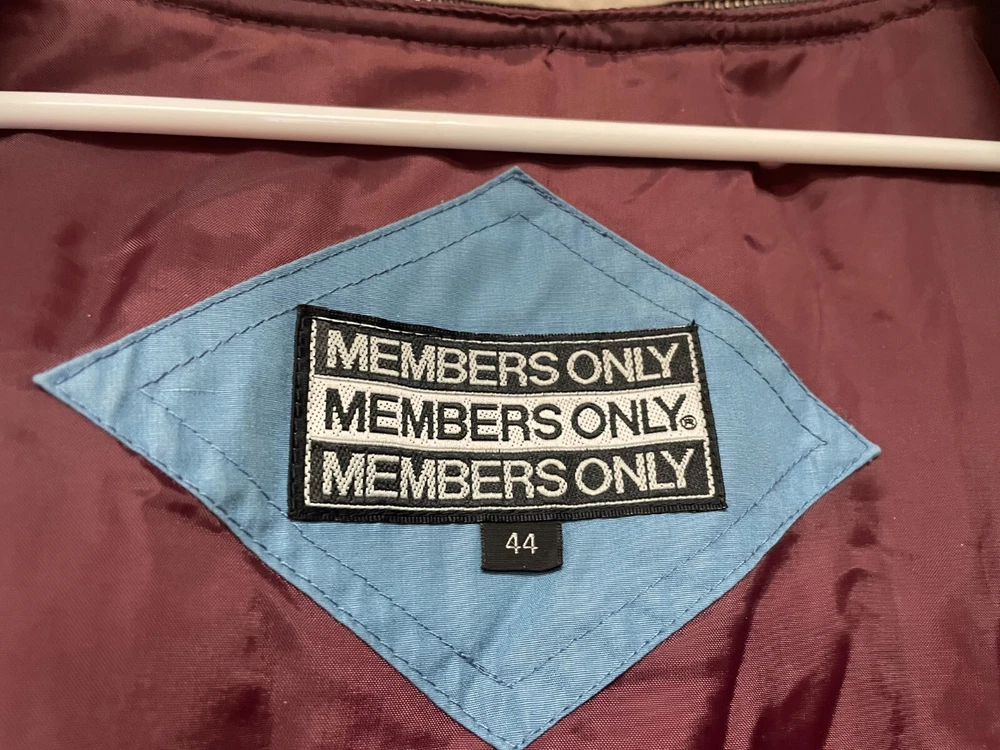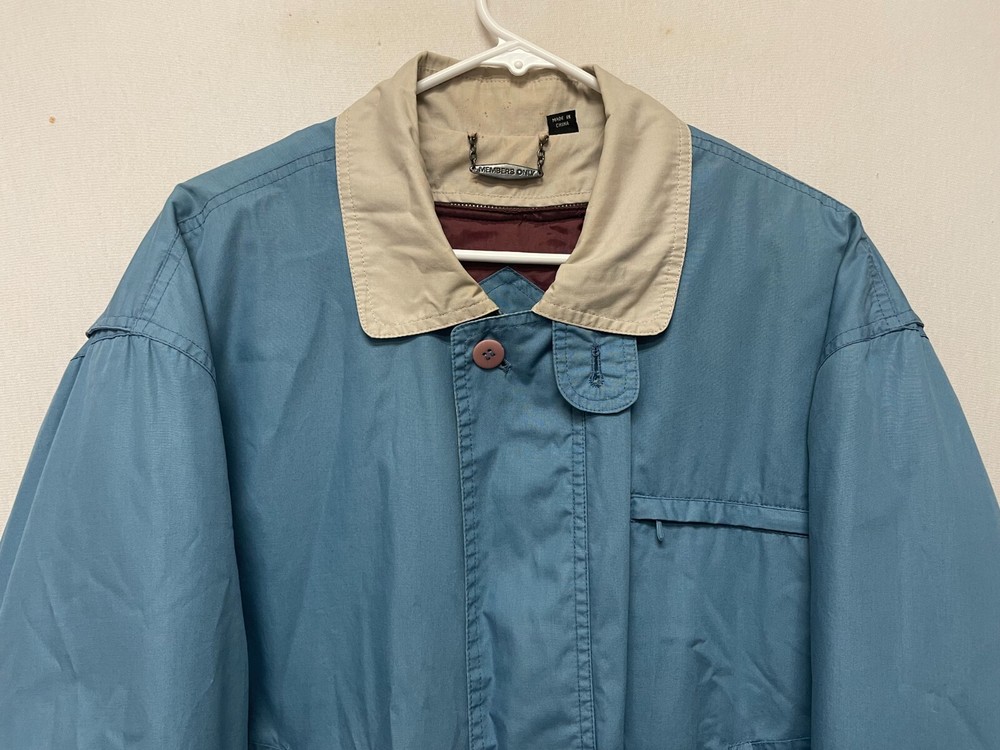 This is a Men's Members Only Jacket in size 44, featuring a removable polyester lining. The jacket is blue in color with a cotton outer shell and polyester lining. It is a bomber style jacket with regular sizing, suitable for everyday wear. Armpit to armpit is 26 Shoulder seam to shoulder seam is 21 Sleeve length from the shoulder seam is 24.5 Length in the rear from the collar seam is 26
