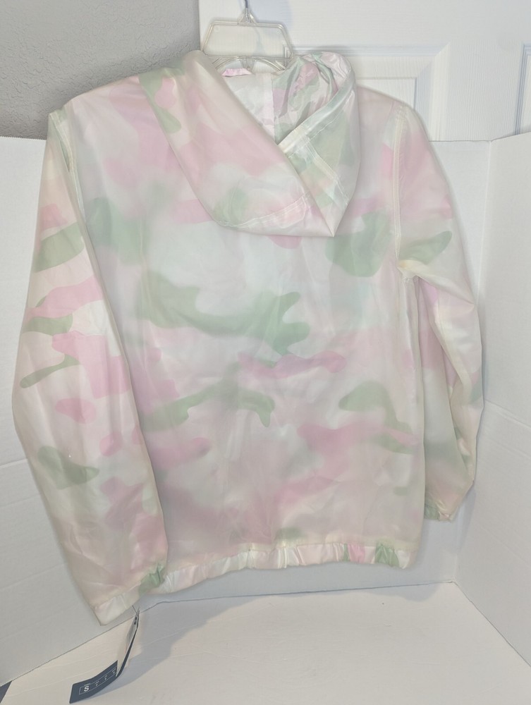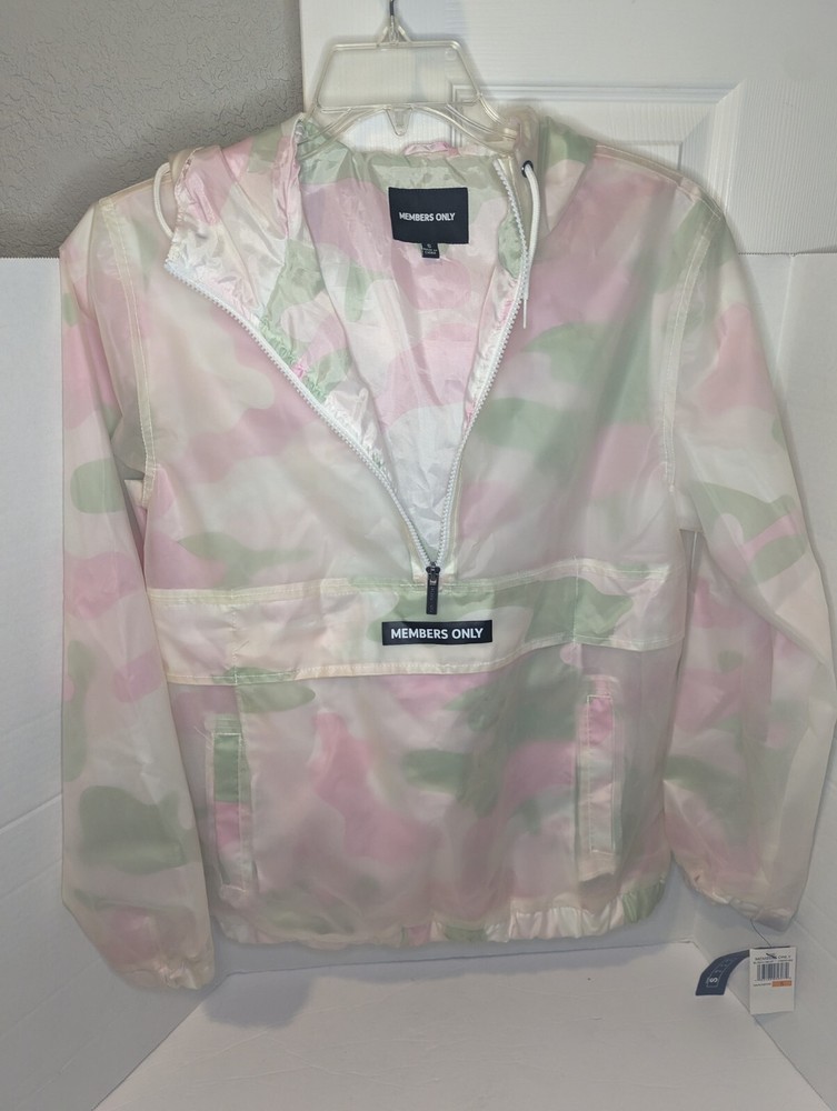 Be ready for any weather with this stylish Members Only Camo pullover rain jacket hoodie in size small. Its unique camouflage pattern and clear color make it stand out from the crowd. This jacket is brand new with tags, ensuring its quality and authenticity. The jacket is perfect for women who love to be fashionable even in the rain. Its regular size type and S size make it a great fit for anyone. This item falls under the Clothing, Shoes & Accessories category and specifically, Women's Clothing, Coats, Jackets & Vests. Don't miss out on this must-have addition to your wardrobe.
