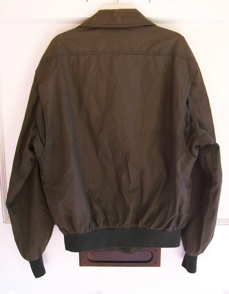~~~~~~~~~~~~~~~~~~~~~ Vintage olive drab green Members Only bomber-style jacket, size 42. The jacket zips up the front and snaps closed at the neck. There are two pockets at the waist that close with snaps. There is an internal pocket at the chest. Measurements Chest 48" Sleeves 24" Length 28" Shoulders 19" Material Shell - 70% Cotton/30% Polyester Body Lining - 70% Cotton/30% Polyester Sleeve Lining - 100% Nylon Knit - 100% Polyester Note: Overall good condition. There is some minor pilling on the knit edges. Pet and smoke free home. Customers agree to abide by store policies and contact us directly and work with us directly with any issues. Our store policies and contact info are on front page of our store. Thanks so much for your interest