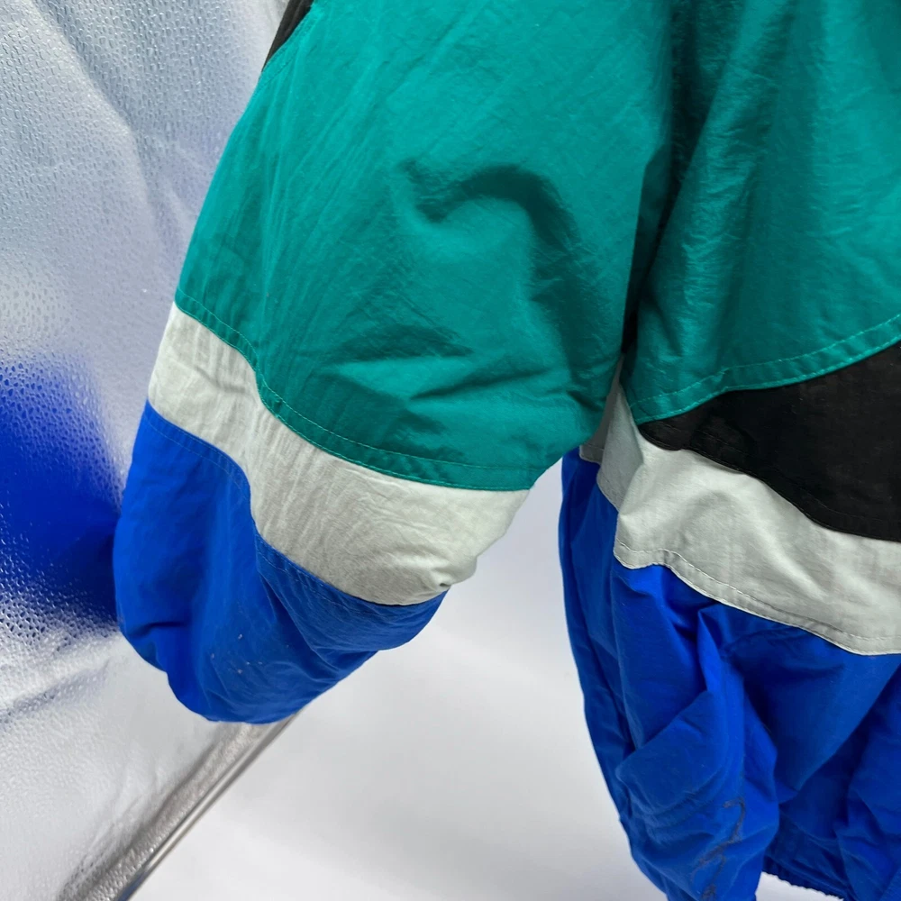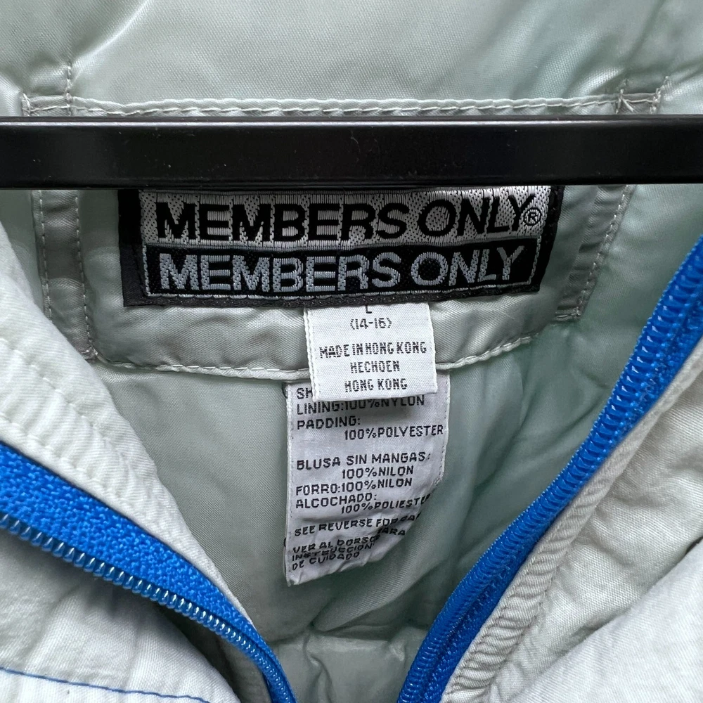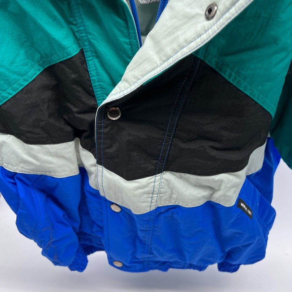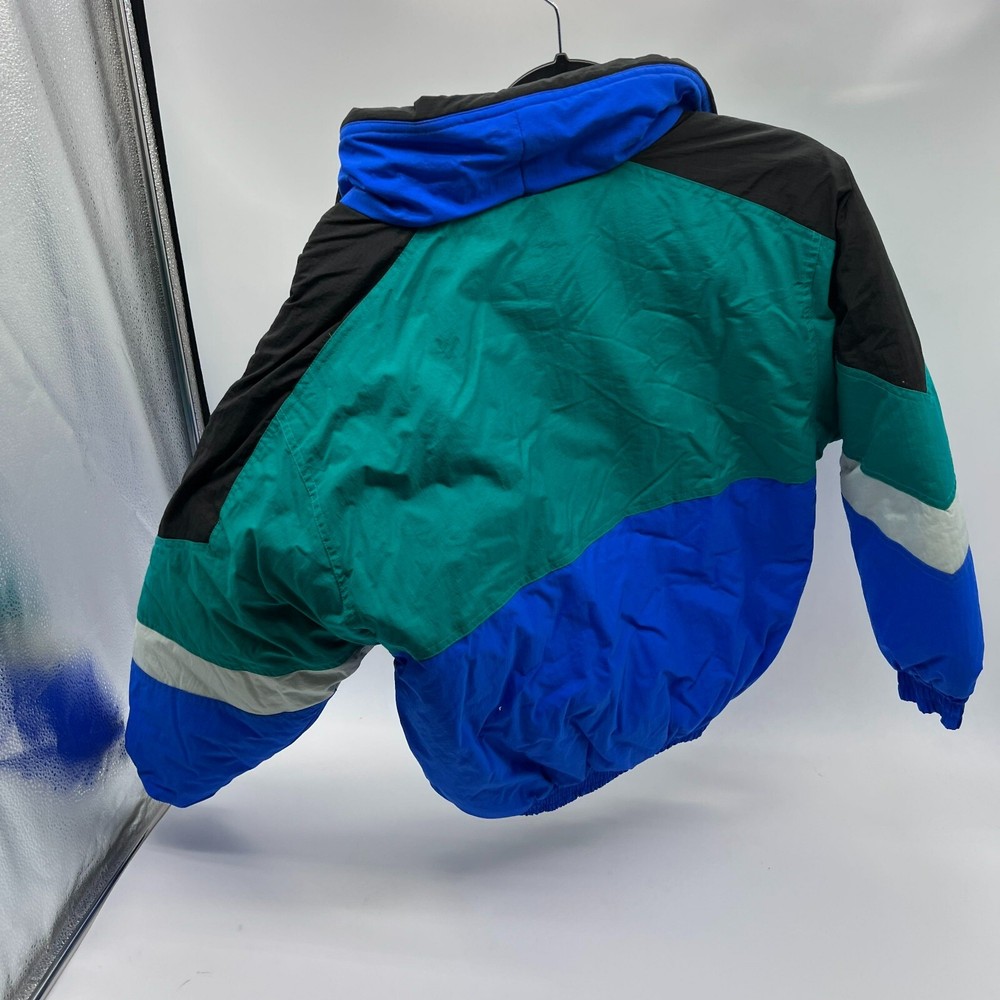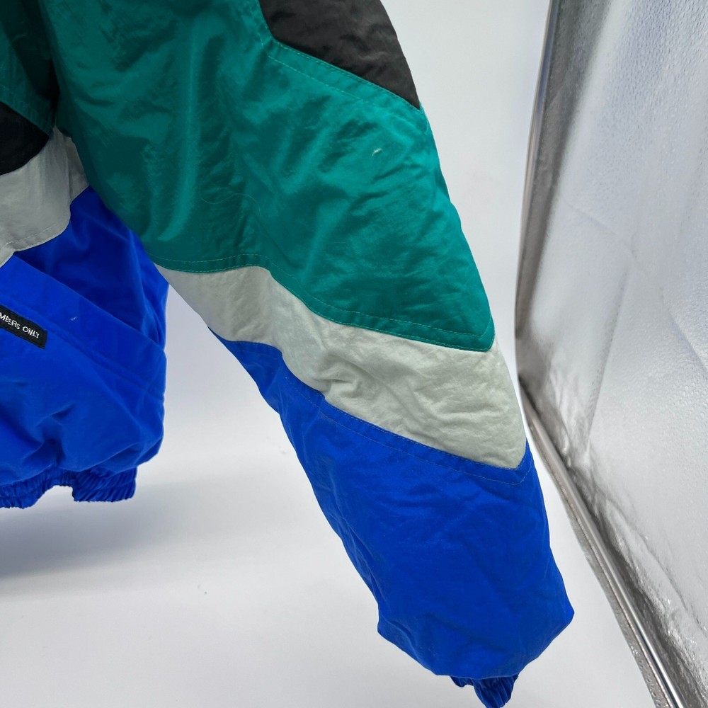 This is a Men's Members Only ski jacket in size L with a multicolor striped design. The jacket is made of nylon with a long sleeve length and features a full zip closure. It has a stand-up collar and a regular fit, suitable for everyday wear. The puffer style jacket is lined with nylon and made of canvas fabric, providing warmth and comfort. Perfect for outdoor activities or casual outings, this jacket offers a stylish and functional addition to any wardrobe. Members Only Mens L Multicolor Ski Jacket Striped Nylon Long Sleeve Full Zip Pit: 21 inLength: 23 inSleeve: 21 in