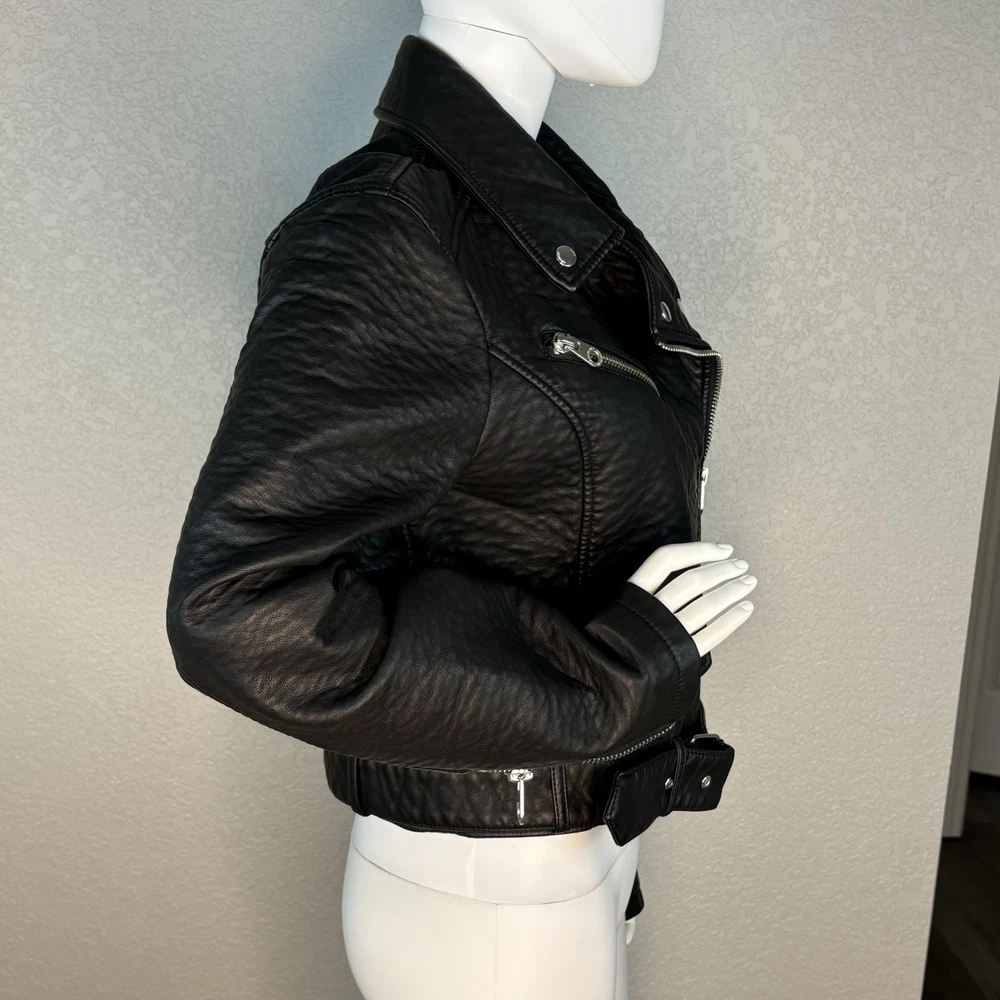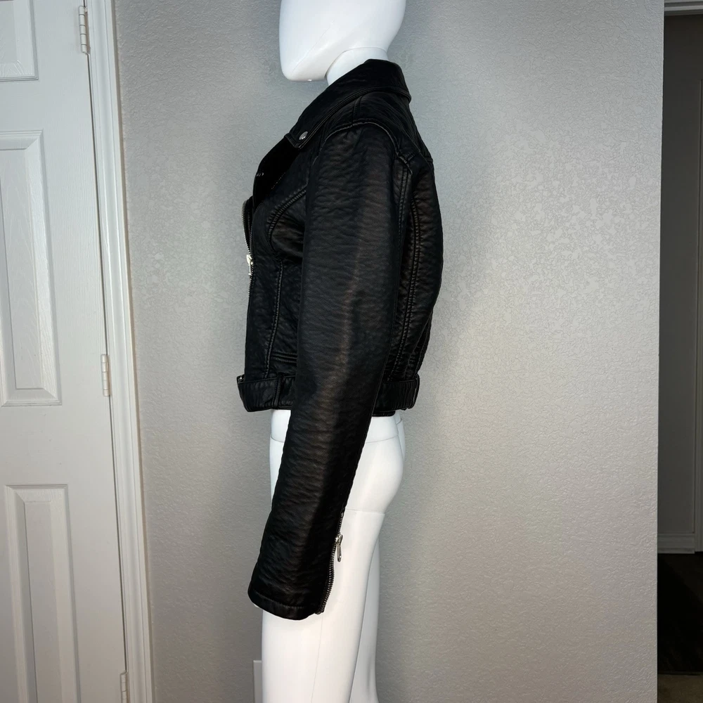 This is a Members Only black cropped faux leather moto jacket in size L. It features a softshell fabric with a thick pebbled texture, full zip and snap closure, lined and collared design, belted waist, and various accents including buttons, straps, buckles, and zippers. The jacket is lightweight and suitable for all seasons, with a classic fit and long sleeves. It has a biker style with a vintage look and is perfect for casual, workwear, or travel occasions. Excellent condition, missing hood Approximate flat measurements (without stretch); Pit-pit 20”, length from shoulder 20”,sleeve from shoulder seam 25”