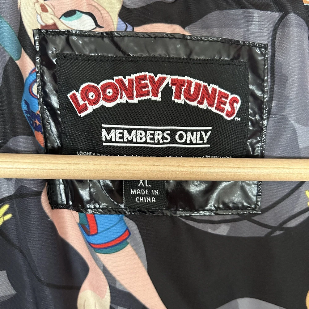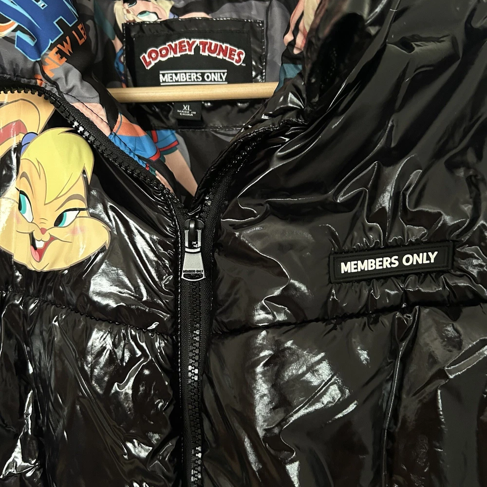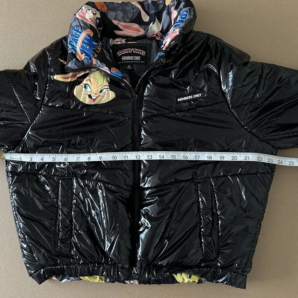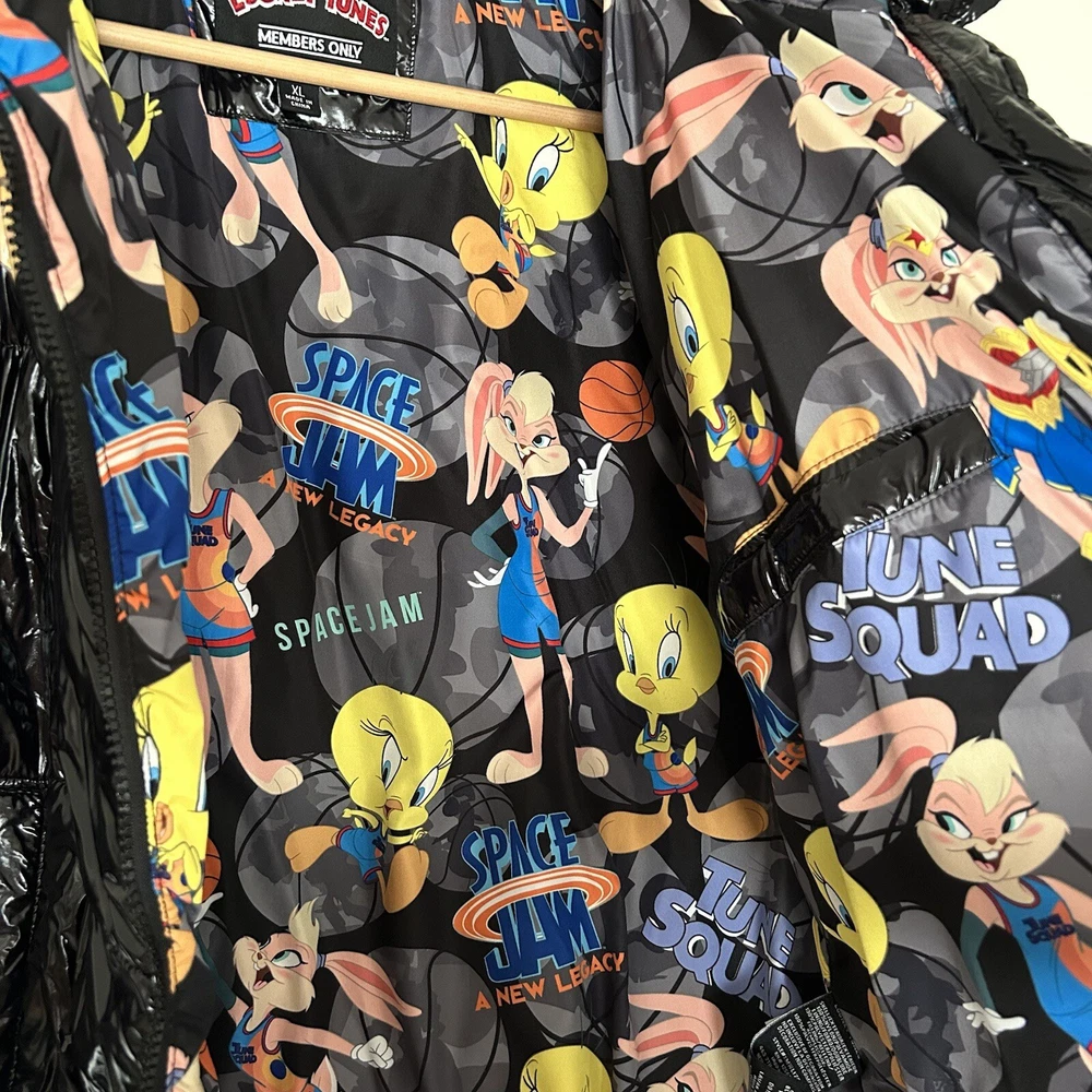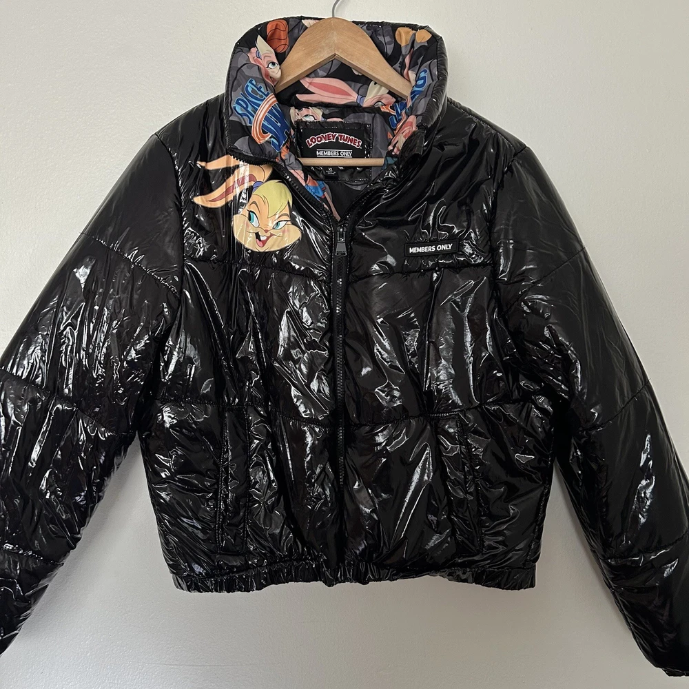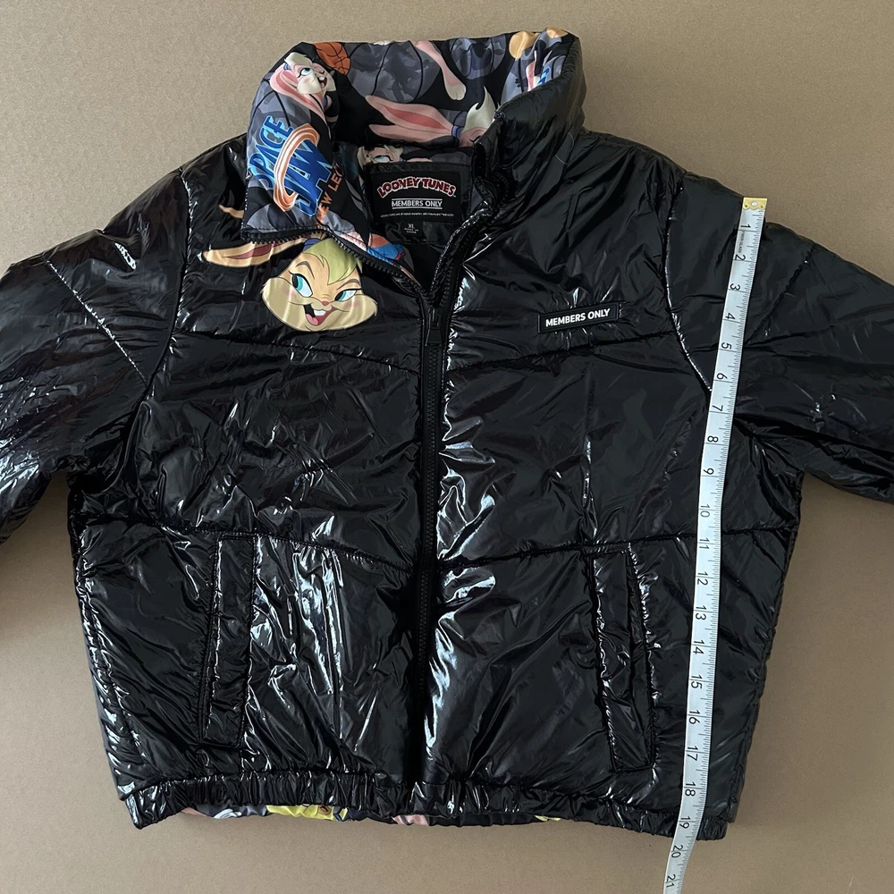 Members Only X Space Jam High Shine Puffer Jacket XL Black Lola Bunny Full Zip Theperfect 90s throwback. This cropped puffer jacket has a shiny nylon construction, a high neck collar with 'Space Jam' lettering, a Lola Bunny graphic on the chest, two side pockets, a space Jam printed lining, and a front zipper closure Black Looney Tunes puffer jacket with Tweety Bird and Lola Bunny design interior Lola Bunny is a Looney Tunes character who first appeared in the 1996 film Space Jam. She is Bugs Bunny's girlfriend and is based on Honey Bunny, who appeared in the Looney Tunes comics. Lola is autistic and doesn't like being called "doll bimbo fashion bimbocore Mcbling style scene scenecore mcbling trashy y2k brohoe early 2000s bling bling tacky 00s broho fruits magazine style Japanese streetwear fruitsfits gyaru bimbocore scene scenecore scene queen scemo cyber emo cybergoth Lola bunny nostalgia nostalgic fan fanatic 90s cartoon favorite character kidcore jacket trendy jacket kandi goth jacket gothic jacket punk emo scene snow jacket ski