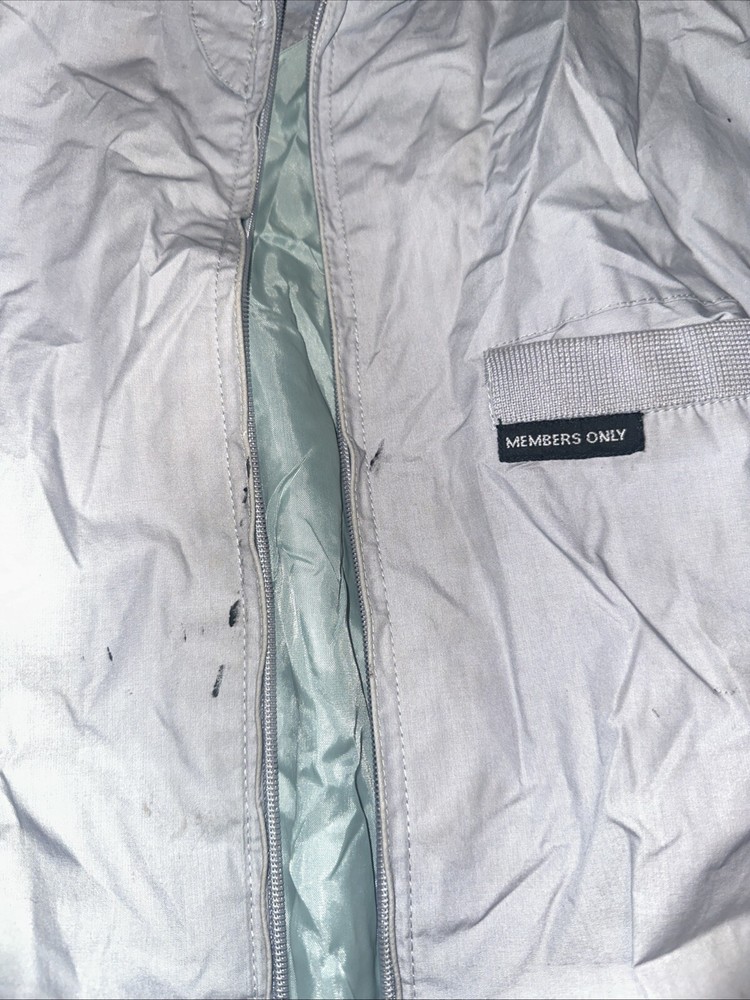 The Members Only Jacket in gray is a type of outerwear for men. It is a regular size XLT and is made for those who want to look stylish and unique. Front stains pictured. No attempt to clean or remove has been made