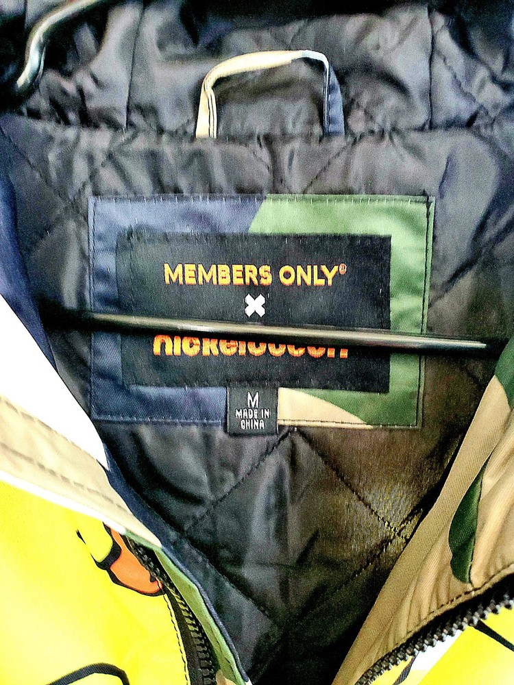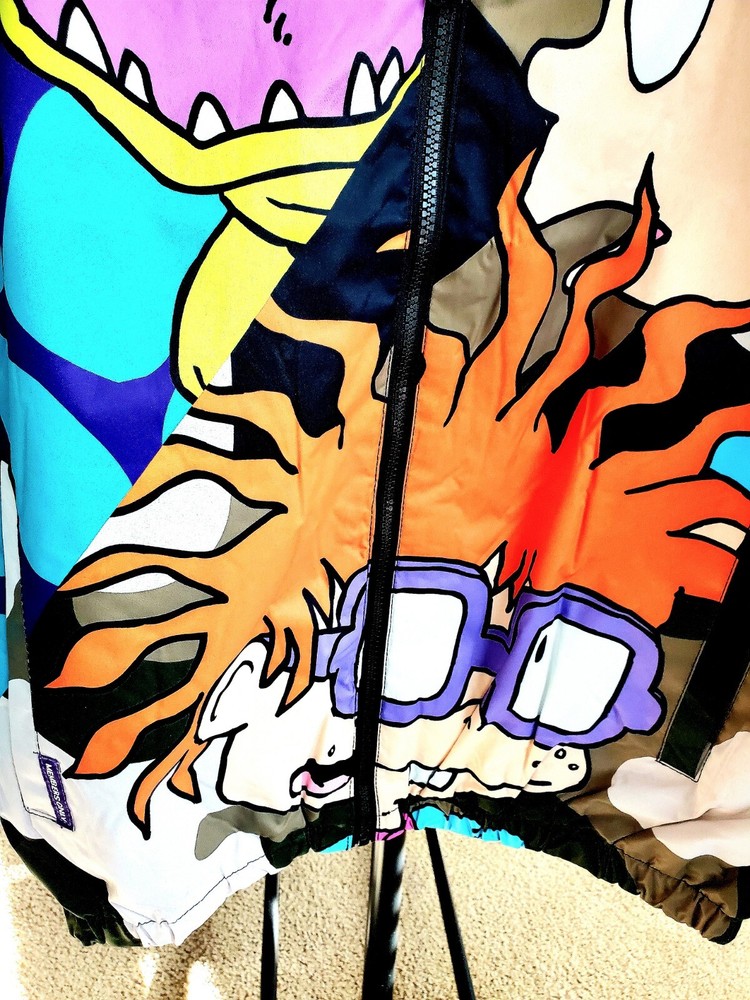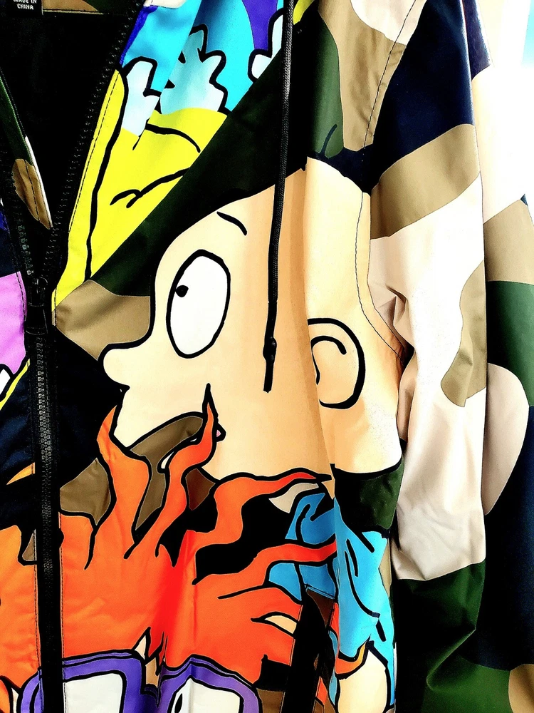 Members Only x Nickelodeon Rugrats windbreaker jacket is a versatile and stylish piece for any casual or travel occasion. The multicolor jacket features a camouflage pattern and is made of polyester material. It has a full zip closure and a band collar style. The jacket is perfect for walking, volleyball, skiing, and running & jogging in the winter, fall, and spring seasons. This mid-length jacket is handmade and has a regular fit. It is machine washable and has zipper accents. The Members Only x Nickelodeon Rugrats windbreaker jacket is a great addition to any wardrobe, perfect for fans of the iconic animated series.