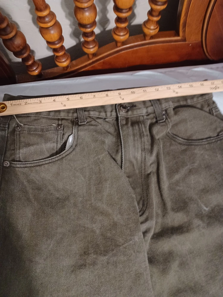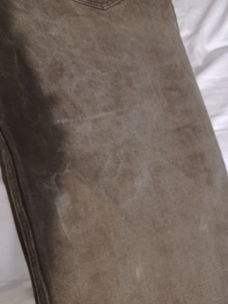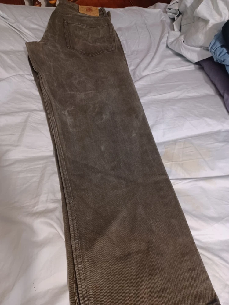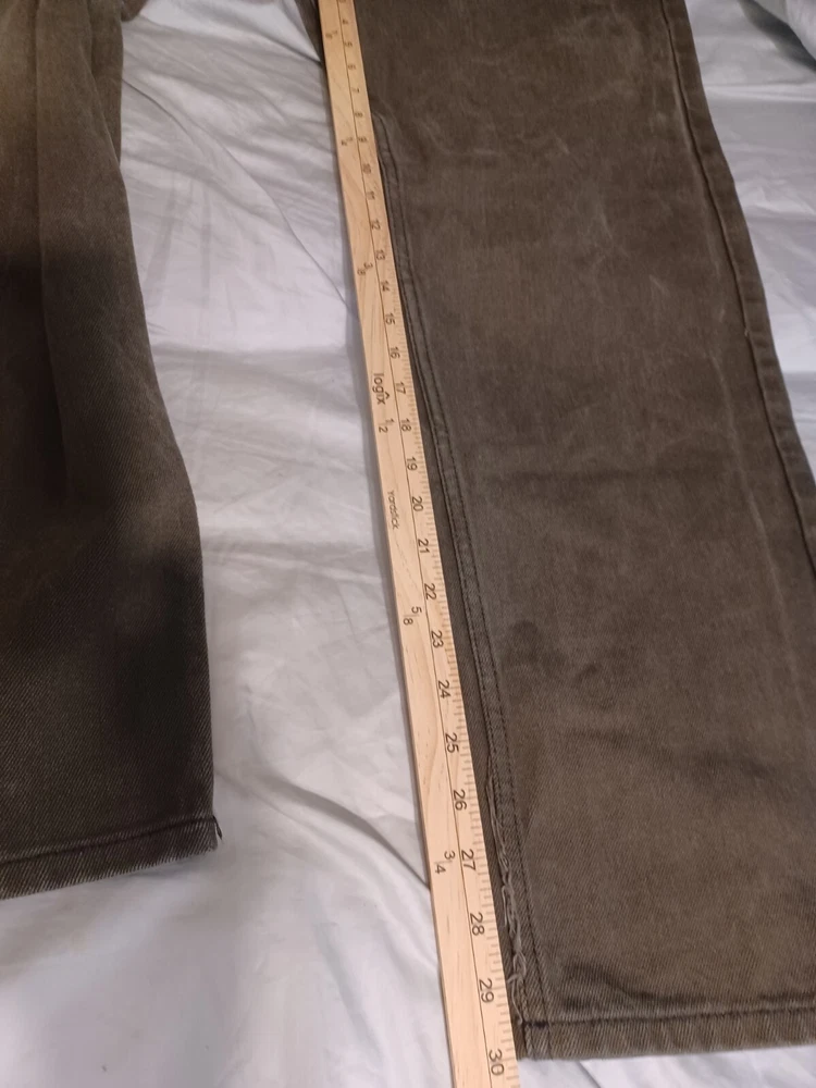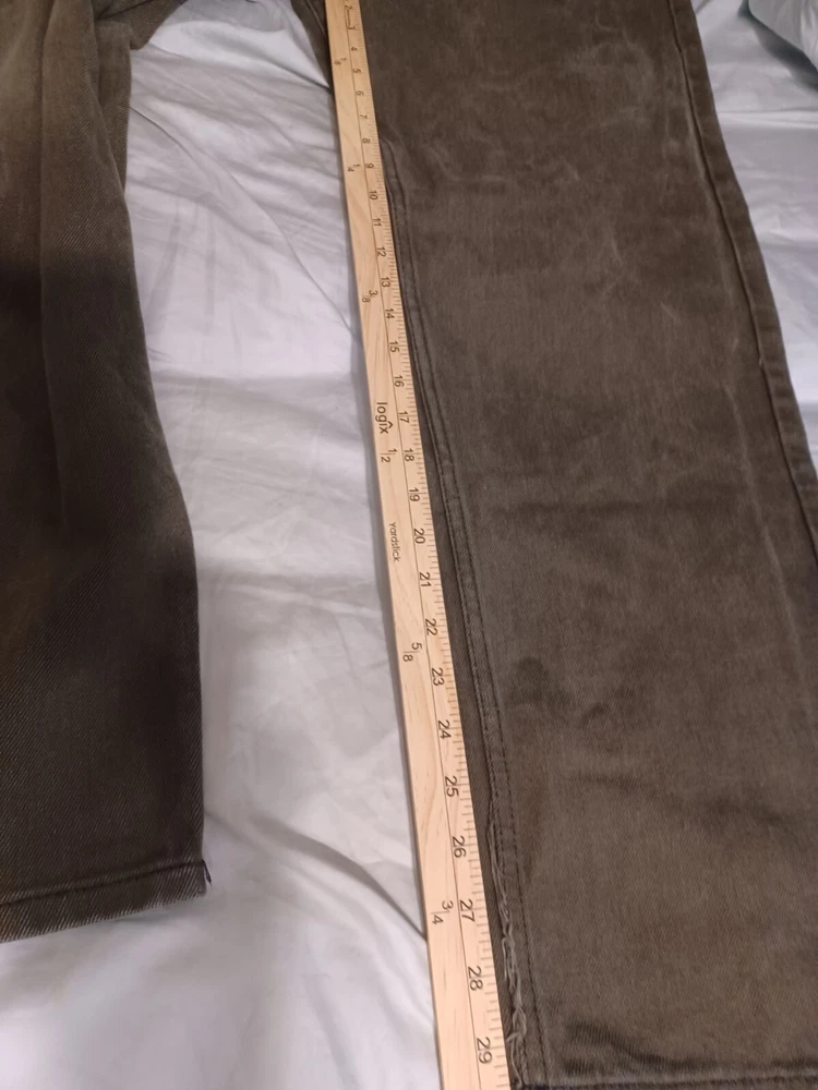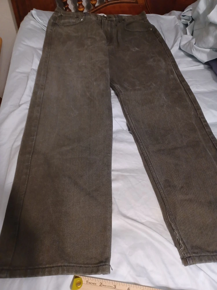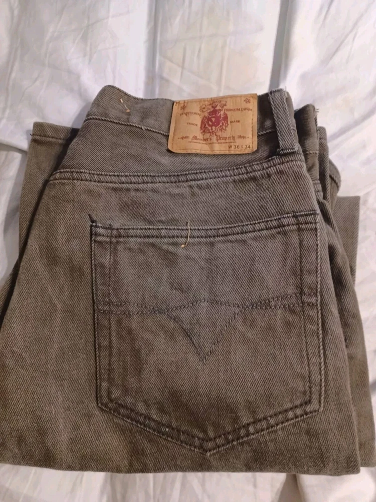 Men's brown denim jeans in size 36x34 from Members Property. These vintage Y2K jeans feature a dark wash, a straight fit, and a mid-rise. The jeans have a solid pattern with button and zipper closures, and are made of cotton with a grunge and skate style. They have accents of buttons and pockets, and are machine washable for easy care. See Photos for actual measure