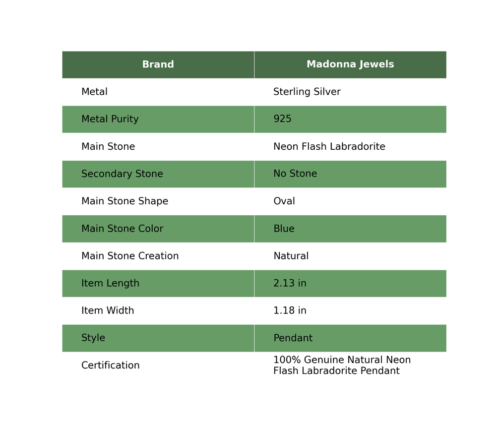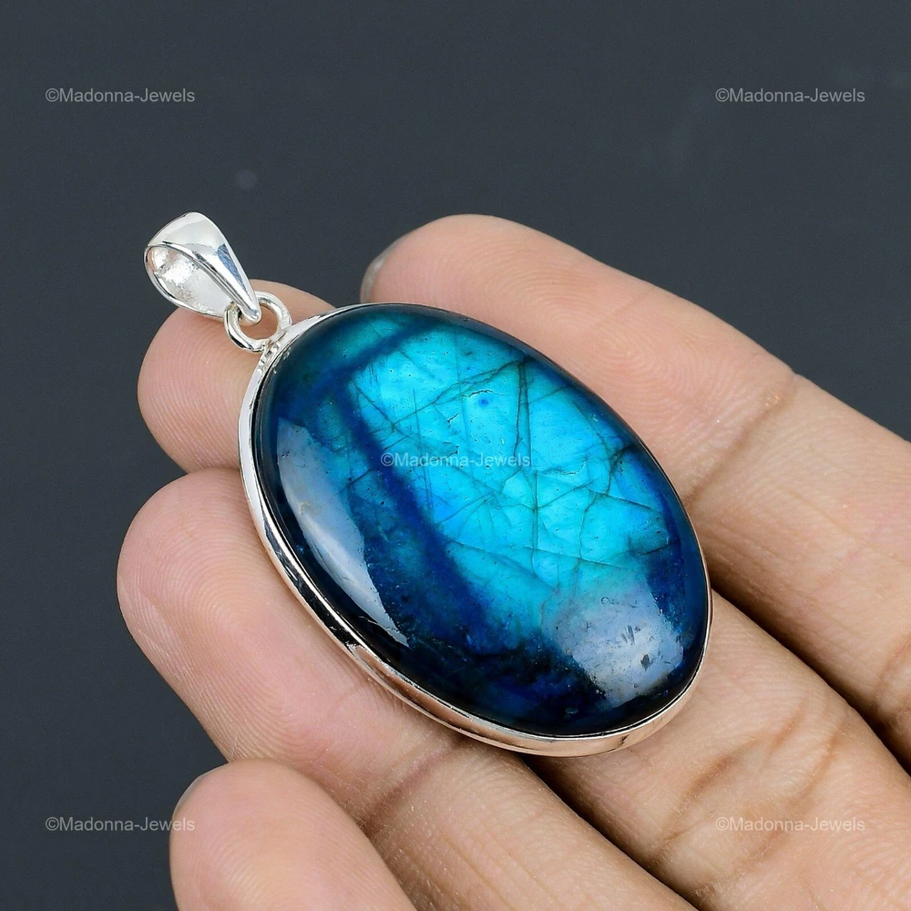 Welcome to Madonna Jewels Memorial Day Sale Neon Flash Labradorite Gemstone 925 Silver Anniversary Pendant Handmade Pendant, Sterling Silver Pendant, Neon Flash Labradorite Pendant, Handcrafted Pendant SKU : VP-61 Gemstone : Neon Flash Labradorite Stone Shape : Oval Metal Purity : 925 Sterling Silver Length : 54 Millimeters Width : 30 Millimeters Silver Jewelry is a popular choice for many people due to its unique properties and numerous benefits. Here are some of the key properties and benefits of wearing silver jewelry: Properties: Durability: Silver is a durable metal that can withstand regular wear and tear. Malleability: Silver is highly malleable, which means it can be easily shaped and molded into various designs. Conductivity: Silver is an excellent conductor of heat and electricity. Anti-bacterial: Silver has natural anti-bacterial properties, which can help prevent the growth of harmful bacteria. Benefits: Aesthetic appeal: Silver jewelry is known for its beauty and versatility, and can be worn with a variety of outfits and styles. Hypoallergenic: Silver is generally hypoallergenic, which means it is unlikely to cause an allergic reaction in most people. Healing properties: Some people believe that wearing silver jewelry can help with various physical and emotional conditions, such as arthritis, anxiety, and depression. Spiritual significance: Silver has been used in various cultures for its spiritual and symbolic significance, and wearing silver jewelry can help to connect with these traditions. Investment value: Silver is a precious metal that retains its value over time, and investing in silver jewelry can be a smart financial decision. Overall, silver jewelry offers a unique combination of beauty, durability, and benefits, making it a popular choice for people around the world. For Mother's Day Gift For Father's Day Gift For Promise For Valentine' Day For Halloween Party For Christmas Day Gift For New Year Party For Mom For Her If you can't find the information you need or need some advice for your design? Feel free to contact us. We are fast to reply :) All our work is made by hand with Love and Care in our workshop Thank you so much for visiting and hope you enjoy shopping with us Madonna Jewels is dedicated to providing customers with high-quality sterling silver jewelry. As a manufacturer of handmade jewelry, we offer an extensive range of silver gemstone jewelry that demonstrates our exceptional craftsmanship. We are skilled in adorning gemstones to complement any style, and we give you the freedom to design your own jewelry collection with dazzling, natural, and genuine gemstones. Our talented craftsmen carefully handcraft each jewelry piece, ensuring that it is unique and made with authentic gemstones. The jewelry item you see on our website is precisely the same one you will receive.