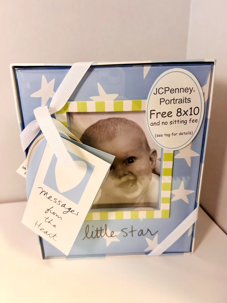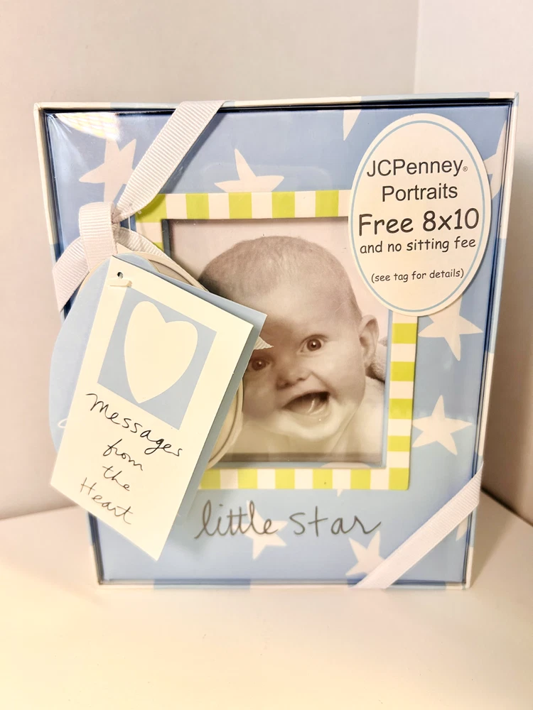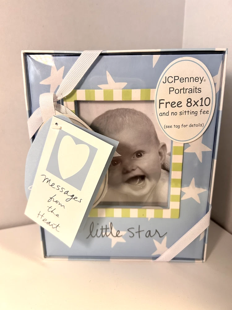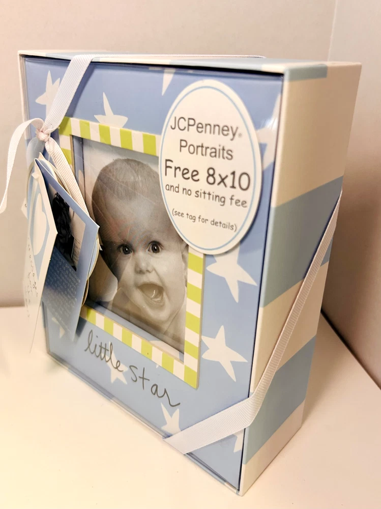 Memory Book Keepsake For Baby Boy Book Light Blue Photo Album NEW IN BOX WITH TAGS. This photo album holds 100 4 inch x 6 inch photos and features a framed place for a photo on the front. Album measures approximately 5.5 inhes wide x 6.75 inches long x 2 inches deep.