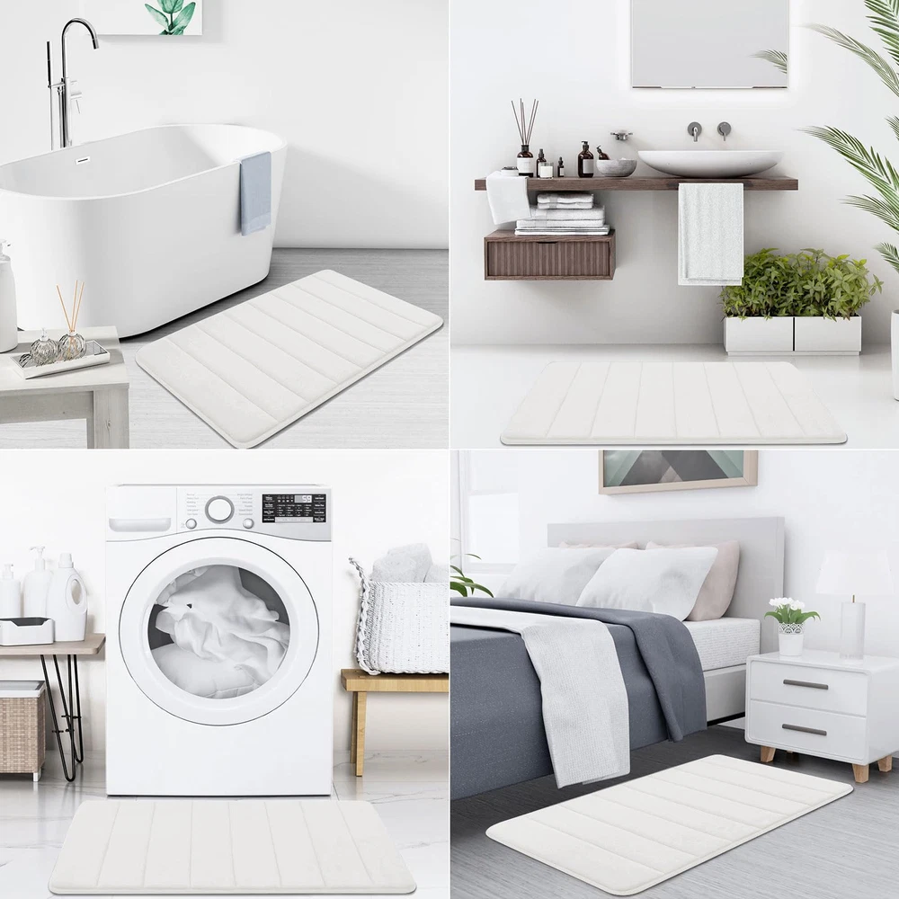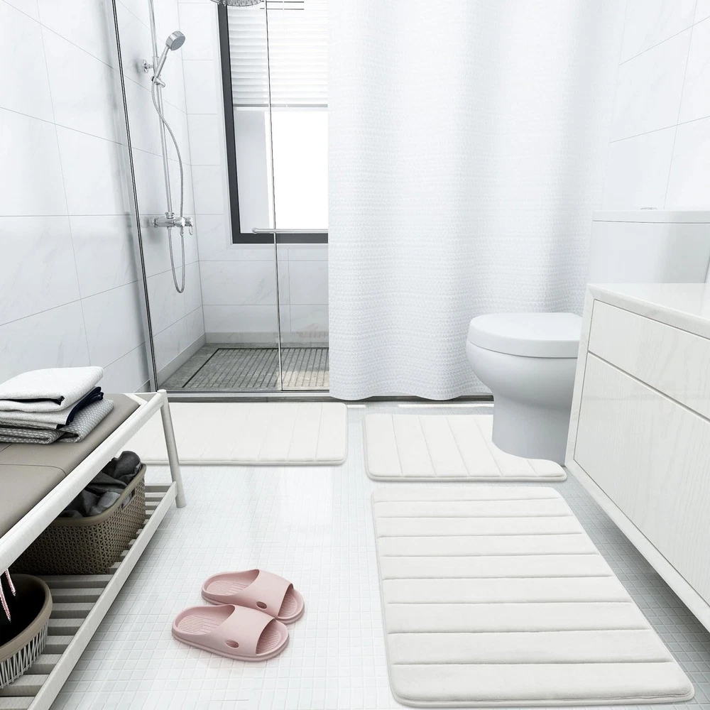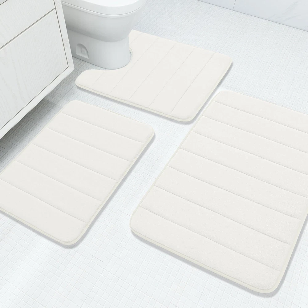Set of 3 Bath Rugs: 1 Small Bath Mat 24"x 16", 1 U-Shaped Contour Mat 24”x 20”, 1 Large Bath Mat 30”x 20”. These Luxurious bath rugs decor your home and give your bathroom a new look Non-slip and Absorbent: The bathroom rugs set backing are reinforced with non-slip PVC dots texture design to helps to stop shifting and keeps the mat in place. And the cozy plush microfiber absorbent water well, after you shower and standing on the mat, water will be absorbed quickly. WARNING: Place mat on CLEAN DRY SMOOTH FLOOR only. Water under bath mats can cause it to slip. Keep bottom of mat dry. Before using bath carpet, test with foot to ensure it doesn't move Soft Memory Foam: The bath mats set are filled with soft and comfortable polyurethane memory foam and the microfiber coral velvet outer material, soft and cozy, giving you unique added support to help eliminate pressure on your feet Machine Washable & Dryable: Machine wash in cold water. Do not use chlorine or bleach. Tumble dry on low heat or lay to air dry, the memory foam bath mat dries exceptionally fast. Color will stay nice and vibrant no matter how many times they’ll be washed and dried Remove the Crease: Our bath mat is packaged using our innovative rolled packaging method. To effectively remove the creases, please follow these steps: 1. Place a damp towel over the folded sections of the bath mat; 2. Gently press and move the iron across the mat periodically. This process should significantly reduce the creases, Once the creases are minimized, the bath mat can be placed anywhere in the bathroom