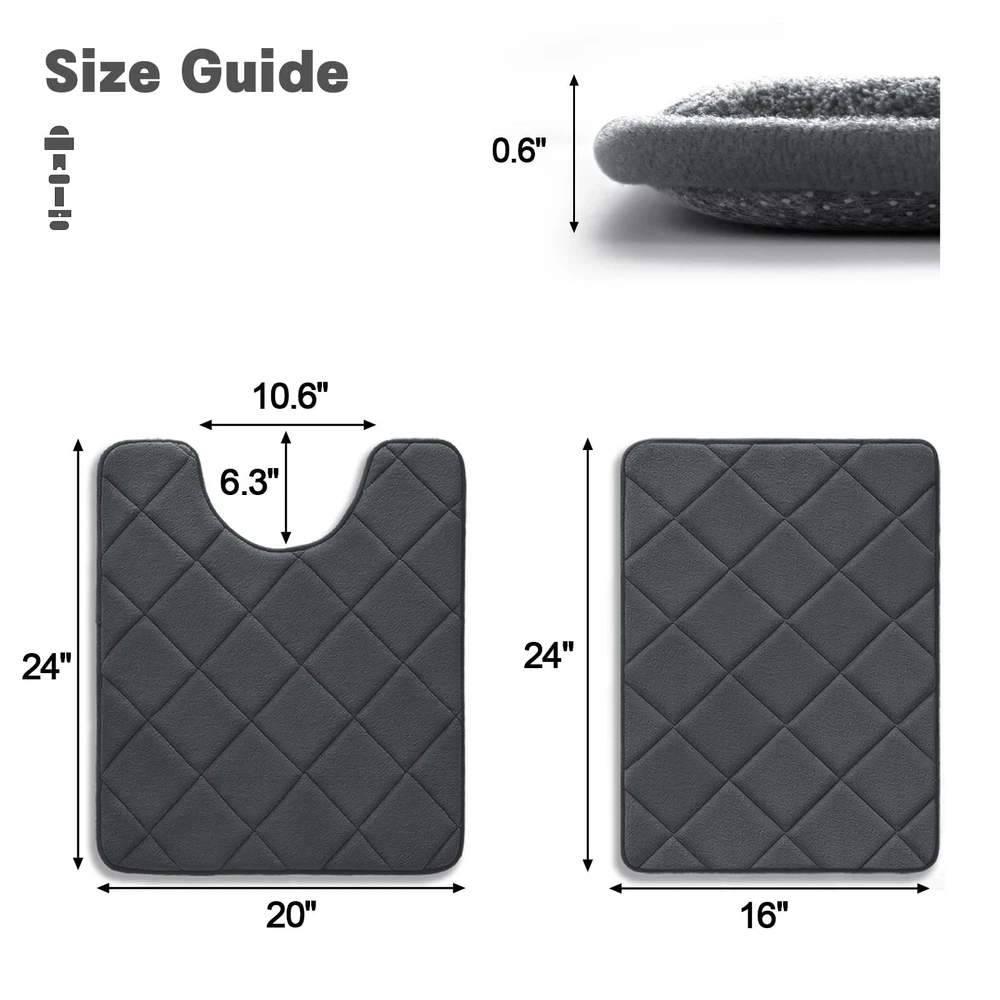 Welcome to Store! 【Bathroom Rugs Sets 2 Piece】Includes toilet rugs u shaped washable 24'x20' and 17 x 24 bath mat. Bathroom rug set can be used by the tub, in front of the sink, on the vanity, or in the living room 【Super Soft and Comfortable】memory foam bath mat set is made of 40D high-density memory foam, providing softer support for your feet and better protection for your knees from cold floors 【Water Absorbing Bathroom Mats 2 Piece】Dense holes in the memory foam bathroom rug set push airflow across the surface for fast water absorption; Keeps floors dry when you step out of the tub, shower or at the sink and keeps drips from messing up your bathroom 【Non Slip Bath Mat】This bath mat rug has a PVC non-slip backing for a stronger grip to help prevent movement and slipping. A safe barrier for the elderly and children after bathing 【Easy To Clean】 Machine wash in cold water and mild detergent (no chlorine or bleach), tumble dry on low speed or hang to dry. The material is durable and will retain its color after repeated washing and drying