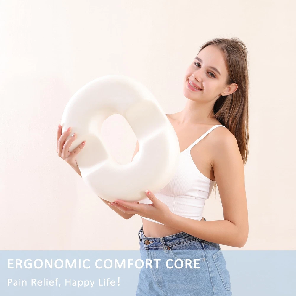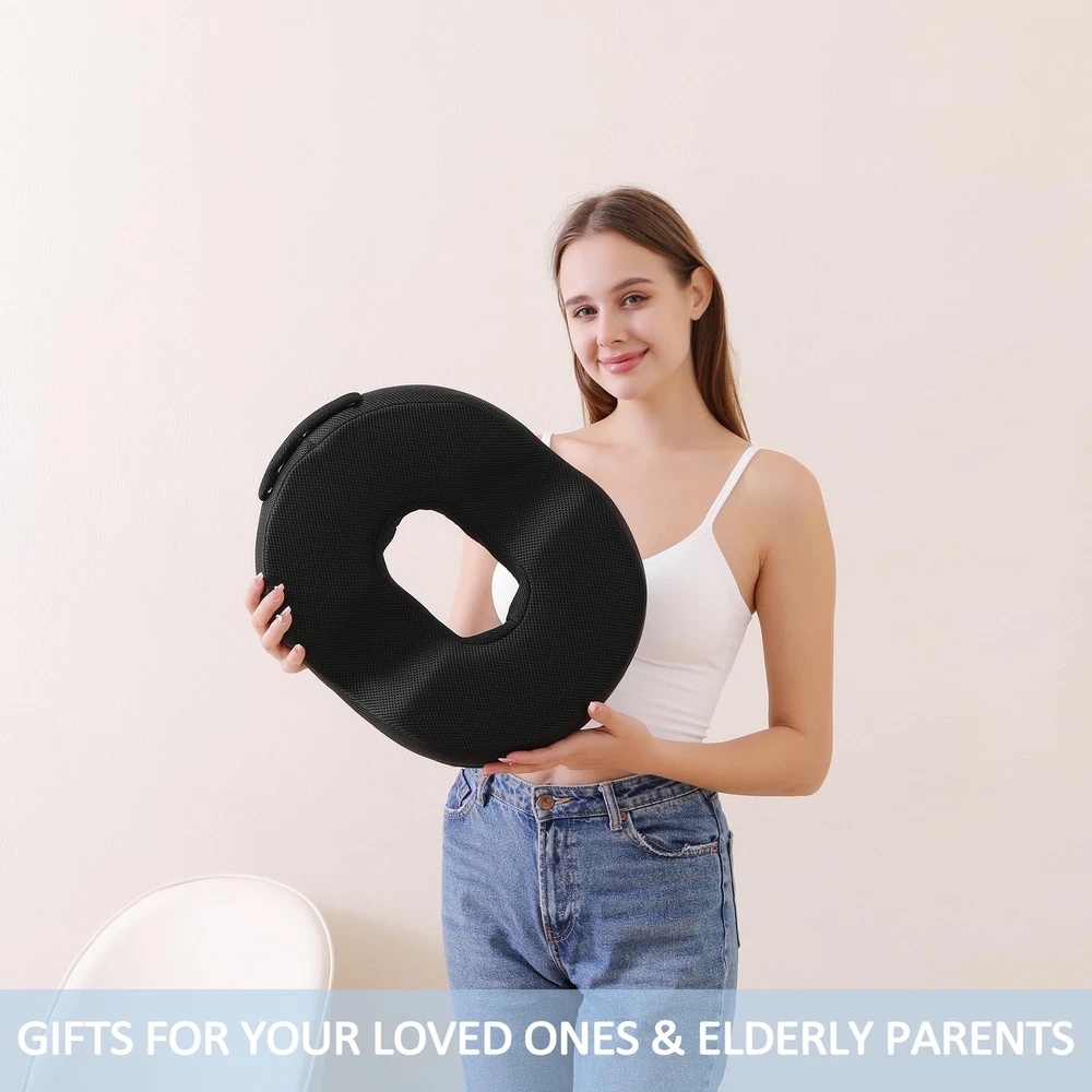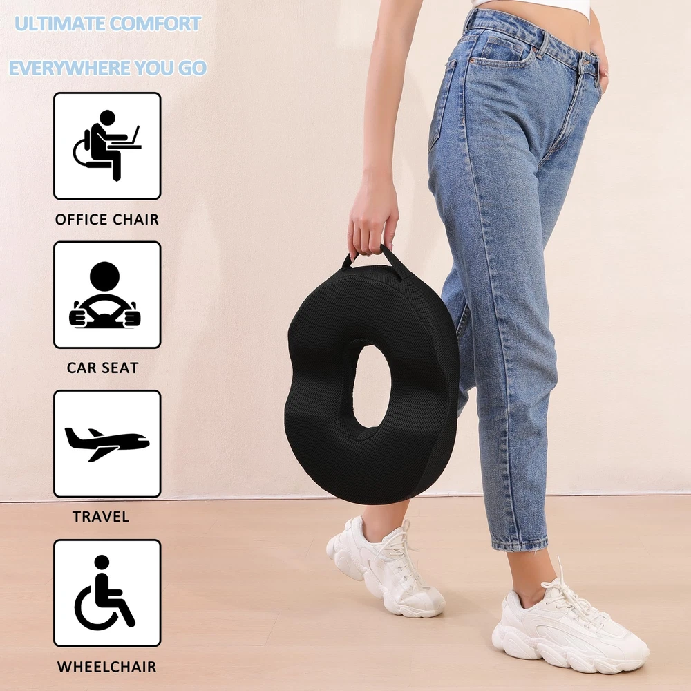 ERGONOMIC COMFORT BUTT DONUT: Relieve the pressure of hemmorhoid, pressure ulcers, prostatitis, postpartum, Tailbone pain, or bed sores, improves & supports proper posture. PREMIUM SITTING FEEL: High-density memory foam core with big hole &”U” shape, 3D airflow mesh cover brings your most sensitive areas dry and comfortable daylong, takes pressure off of the hemorrhoid, tailbone. UNIVERSAL USE: Portable with handle for use at home office or travel. Use as office chair cushion, car seat cushion, or wheelchair cushion. You can even take it on the plane, sitting comfort anywhere! This doughnut cushion measures 16x13x3 inches fits man and woman weight up to 240 lb. WASHABLE REMOVABLE COVER & NON-SLIP BOTTOM: Simply unzip the cover, remove it from the pillow and toss cover in the washing machine. High quality non-slip silicone spots on the bottom for non-slip, high performance use on hard and smooth surface. EVEN WEIGHT DISTRIBUTION: This sitting donut cushion is engineered with ComfortSupport foam to provide the balance you need between supporting you on the chair surface and the comfort to sit frustration-free.