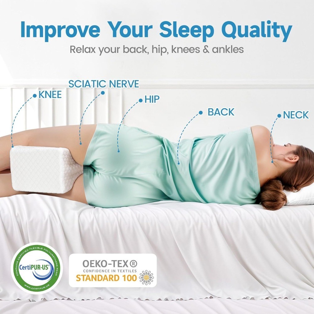 【Better Sleep Experience】Made of high-quality memory foam, our knee pillow provides exceptional support for your legs and knees. It helps you maintain a comfortable and proper sleeping posture, ensuring a restful nights sleep 【Smooth Spine Alignment Pillow】When we sleep on our side, the spine may bend unnaturally and our joints may become damaged. But our alignment pillow helps people maintain the natural curve of the spine and reduces friction between joints 【Ergonomic Design】Sized at 10.6"L x 7.9"W x 5.9"H, the larger size fits your body better. It features an ergonomic design that supports your knees, hips and lower back. It improves blood circulation and is beneficial for users with sciatica, hip and back pain 【Easy to Maintain】Equipped with a smooth zipper and removable soft and breathable cover, it is easy to wash and keep your knee pillow fresh. The slow-rebound memory foam ensures that it retains its shape after each use without becoming easily deformed 【Leg Pillow for Side Sleepers】SereneCloud knee pillow molds to your leg perfectly. You can position it between your thighs, knees, or calves, or place it beneath your legs. Its firm support ensures stability without shifting during the night