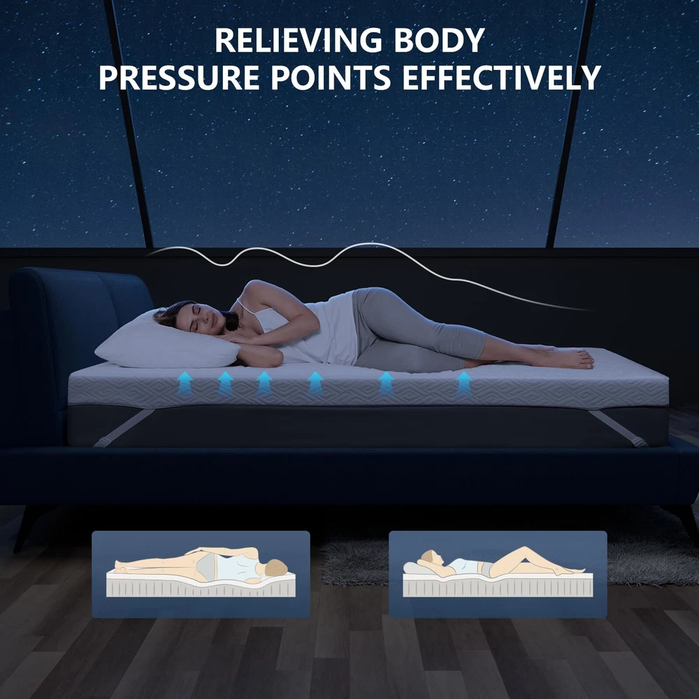 CertiPUR-US Certified Mattress topper - The 3-inch gel memory foam mattress topper made of CertiPUR-US certified materials,experience ultimate comfort and breathability. The topper is not only safe but also offers a cool and comfortable sleeping experience. The outer fabric used of Premium Bamboo Fiber, making it durable and skin-friendly Say Goodbye to Slipping Mattresses - The mattress topper features a non-slip design with gel anti-slip particles that increase friction and prevent displacement, plus four adjustable elastic straps to keep it securely in place. Enjoy a restful night's sleep without the hassle of constantly adjusting your mattress. Experience Supreme Comfort - The 3-inch mattress topper effortlessly elevates your sleeping experience by adding softness and extra support to your mattress. The breathable material dispels pressure off your body, ensuring cozy sleep while regulating your body temperature, leaving you feeling refreshed when you wake up. Breathable & Cool - The foam mattress topper used airflow channels and cooling gel infusion for a refreshing night's sleep. Say goodbye to uncomfortable heat and hello to a cooler, more comfortable sleep experience. Conveniently Portable - Take this foam mattress topper with you wherever you go! Perfect for use on sofa beds, air mattresses, and floors, it easily rolls out and provides instant comfort. Please allow 24-48 hours for the topper to fully expand (may take longer in low temperatures).