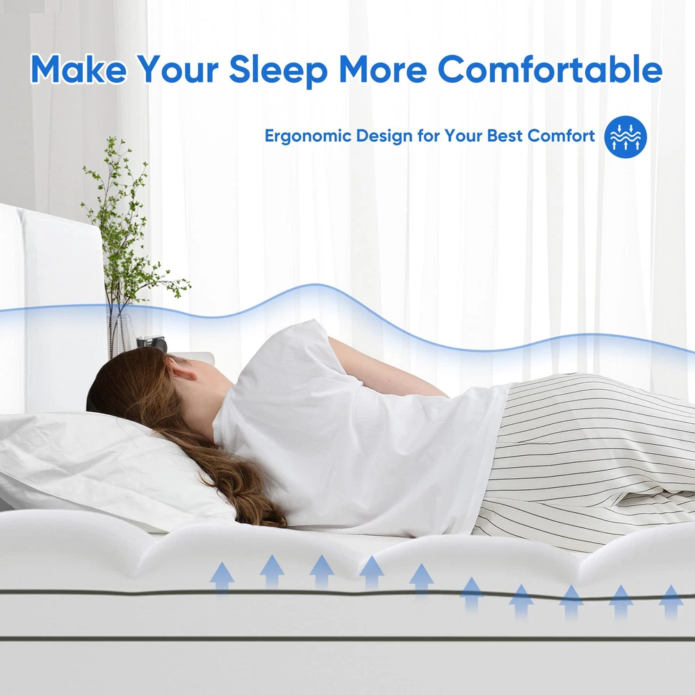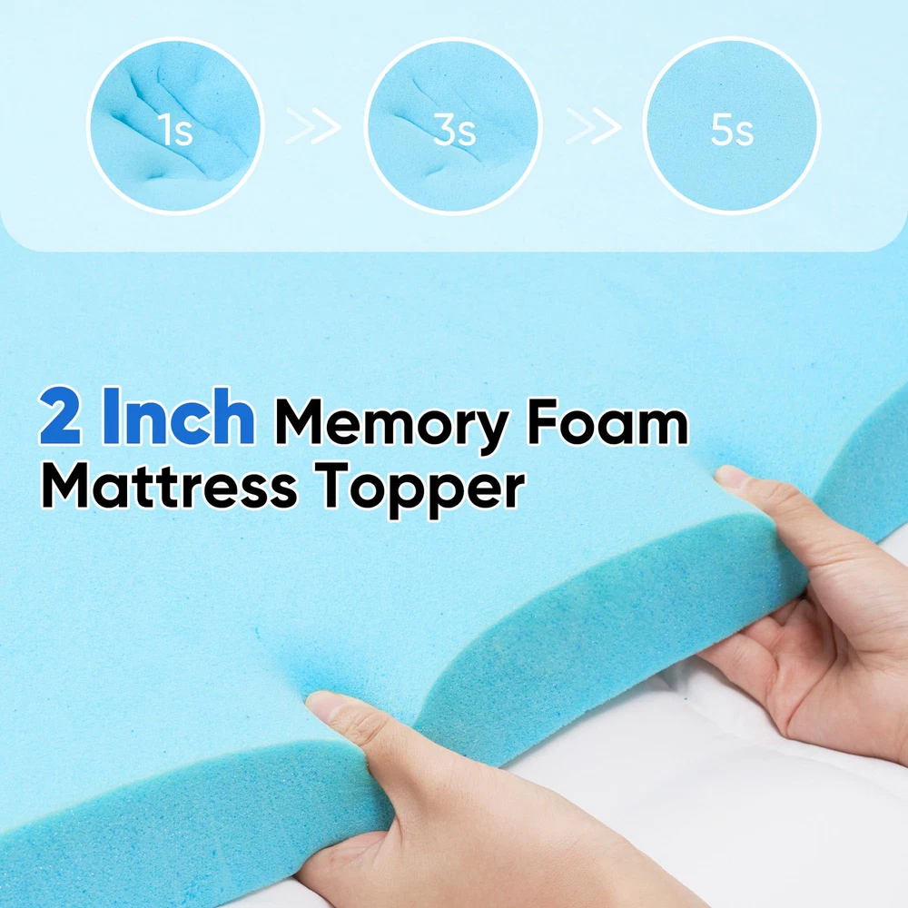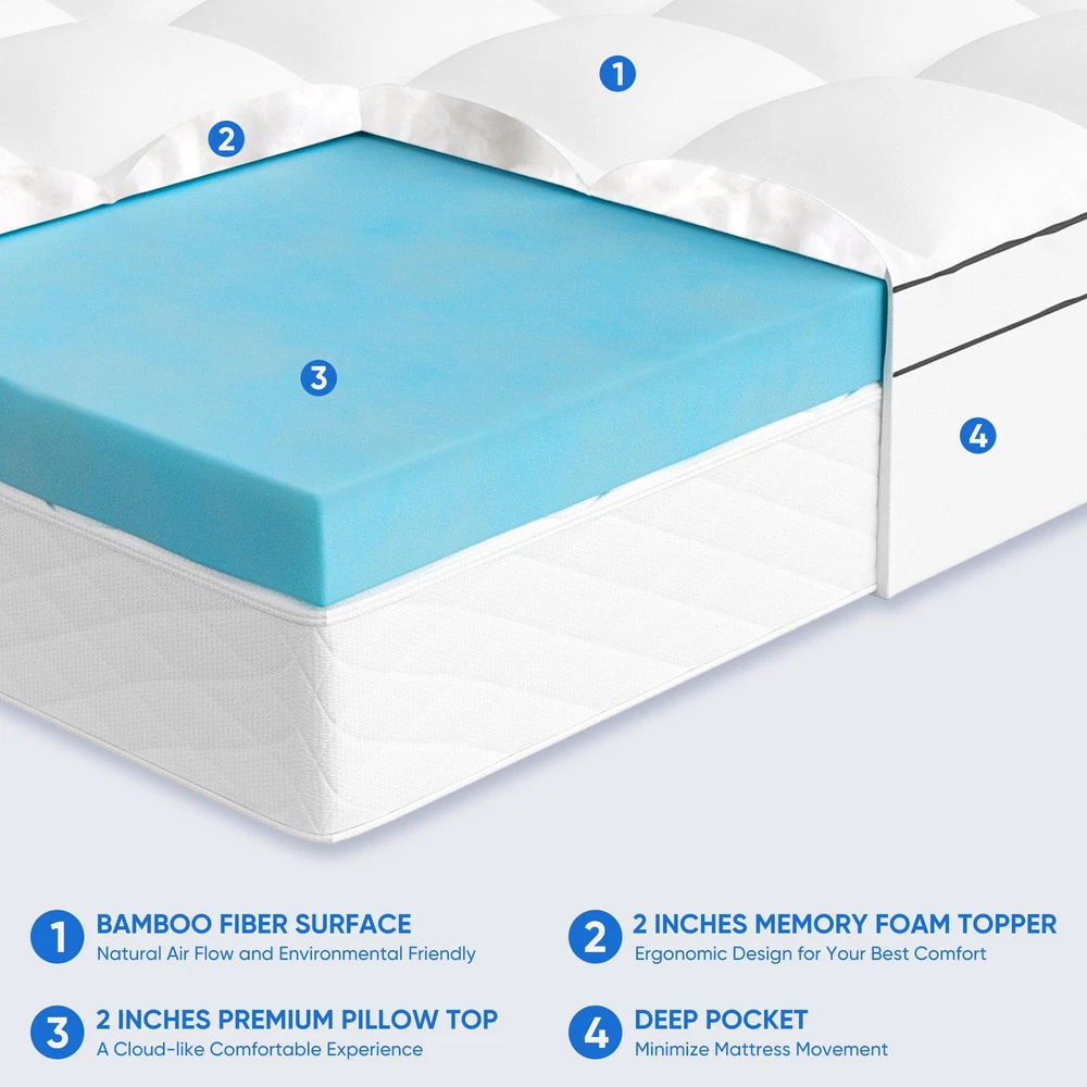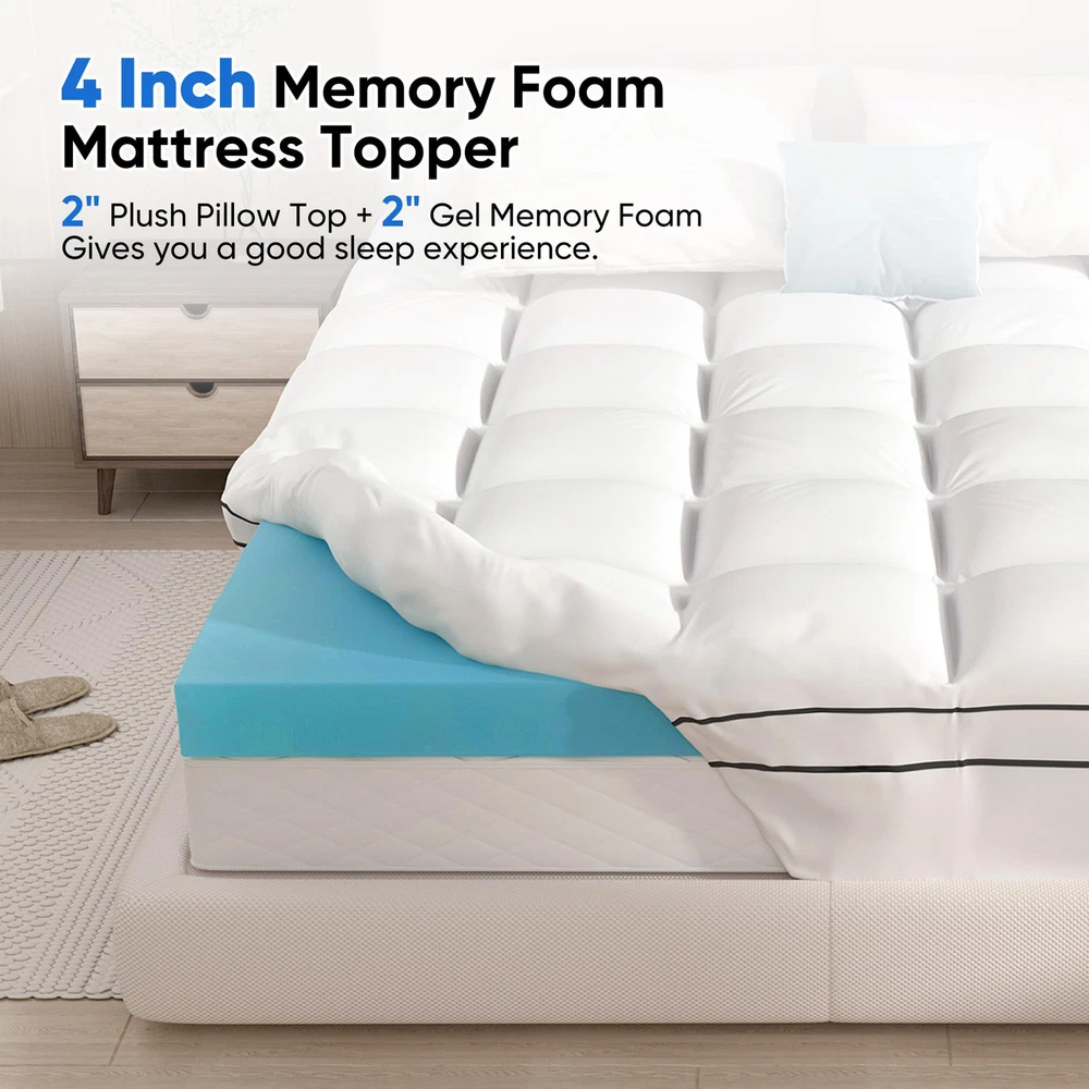 💪【2-In-1 Dual-Layer Design】Our innovative 4 inch dual-layer mattress topper can elevate your sleep experience. It comprises a 2-inch cooling gel-infused memory foam pad and an additional 2-inch plush quilted mattress topper. 💪【Superior Comfort】 Crafted from high-quality polyester fabric, our ultra softness and comfort mattress topper offers you a cloud-like sleep space. Gel technology in foam absorbs and disperses heat, maintaining good breathability. 💪【8"-21" Deep Pocket & Machine Washable】The mattress topper features a dynamic 8"-21" elastic deep pocket with a 360° all-around elastic skirt,which allows it to perfectly wrap your mattress. And our mattress topper can machine washable, featuring a gentle cycle with cold water and tumble dry on low for easy maintenance. 💪【Relieve Pressure & Certified Quality】Our 4-inch memory foam conforms flawlessly to the body's curves, greatly relieves pressure on the shoulder, back, neck, and spine, making it comfortable and improving sleep. ❣️【Package & Service】Due to vacuum packaging, the mattress may unevenly compressed upon arrival. Please shake, pat or place in a ventilated area for 48 hours, it will gradually regain its fluffiness. If you have any questions or concerns about our mattress topper, please don't hesitate to reach out to us anytime. We are dedicated to providing a satisfactory solution within 48 hours.