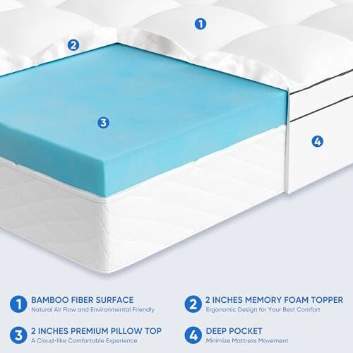 Return Policy Fast Delivery Trusted seller Memory Foam Mattress Topper Dual Layer 4 Inch Queen Size, 2 Inch Cooling Gel Memory Foam Plus 2 Inch Down Alternative Pillow Top Mattress Pad Cover with 8-21 Inch Deep Pocket Product Description ?【2-In-1 Dual-Layer Design】Our innovative 4 inch dual-layer mattress topper can elevate your sleep experience. It comprises a 2-inch cooling gel-infused memory foam pad and an additional 2-inch plush quilted mattress topper. ?【Superior Comfort】 Crafted from high-quality polyester fabric, our ultra softness and comfort mattress topper offers you a cloud-like sleep space. Gel technology in foam absorbs and disperses heat, maintaining good breathability. ?【8"-21" Deep Pocket & Machine Washable】The mattress topper features a dynamic 8"-21" elastic deep pocket with a 360° all-around elastic skirt,which allows it to perfectly wrap your mattress. And our mattress topper can machine washable, featuring a gentle cycle with cold water and tumble dry on low for easy maintenance. ?【Relieve Pressure & Certified Quality】Our 4-inch memory foam conforms flawlessly to the body's curves, greatly relieves pressure on the shoulder, back, neck, and spine, making it comfortable and improving sleep. ❣️【Package & Service】Due to vacuum packaging, the mattress may unevenly compressed upon arrival. Please shake, pat or place in a ventilated area for 48 hours, it will gradually regain its fluffiness. If you have any questions or concerns about our mattress topper, please don't hesitate to reach out to us anytime. We are dedicated to providing a satisfactory solution within 48 hours. Shipping Returns Payment Shipping Shipping is FREE to all addresses other than APO/PO boxes in the lower 48 states. All our stock ships from US-based warehouses. Shipped via USPS or UPS (depending on location and package weight) Unless stated otherwise, all orders will ship within 24-72 hours of your payment being processed. Check our feedback to see the great reviews of FAST shipping we offer. Returns Seller does not accept returns Payment We currently accept payment via eBay managed payments only. Once payment is cleared, we will dispatch your shipment within 1-3 business days. Please refer to the "Shipping" tab for more information regarding shipping speed to your destination.