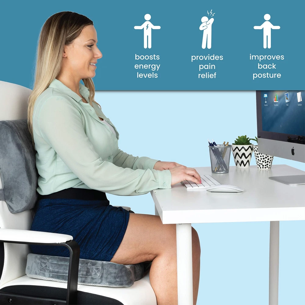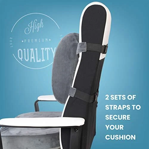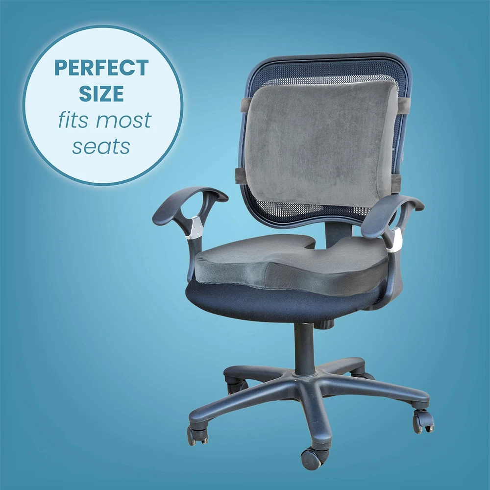 SET - Includes BOTH seat and back cushion. The Lumbar Back Cushion provides comfort and support and is made from contoured memory foam. The Memory Foam Seat Cushion is ergonomically designed to reduce pressure on the tailbone and coccyx while offering proper support and a comfortable seating surface. Coccyx cushion core is supportive memory foam offering support and proper immersion and pressure . Plush velvet cover offers a comfortable and cozy seating surface. A non-slip bottom ensures the cushion stays firmly in place. Together the seat and back cushion provide hours of comfortable seating. Use as a car seat and back cushion, office chair cushion, wheelchair cushion, home or anywhere for comfortable seating. Perfect hemorrhoid pillow. Ideal for back pain, post surgery, pregnancy, prostate treatment, and butt pillow after surgery. Sciatica cushion. Use as a chair cushion for pressure . Super comfortable, it will become your favorite desk chair cushion set. 2 Piece Set - Includes both the memory foam seat and memory foam back cushions. Great Value, Greater Comfort. MEMORY FOAM - The object of a cushion is pressure .This memory foam provides optimal support and cushioning, making it the perfect cushion. Car seat cushion set, Truck seat cushion set. Office chair cushion set. Tailbone pain cushion - Lower back pain, sciatica, post surgery, and pregnancy. Also used as a hemorrhoid pillow. The Lumbar Cushion contours and promotes proper seating while relieving back pain . Includes 2 extender straps. Plush gray velvet cover offers a comfortable, cozy and stylish seating surface.Lumbar cushion includes top and bottom straps for stay in place positioning. Cover is removable and washable. LARGE SEAT CUSHION SIZE - approx. 18 x 14 x 3 inches. Portable and easy to use, convenient carry handle on seat cushion - Use the seat cushion in your car, office, wheelchair, home or anywhere for comfortable seating. Butt pillow after surgery. Seat cushion for truck driver, cushion for car driver.