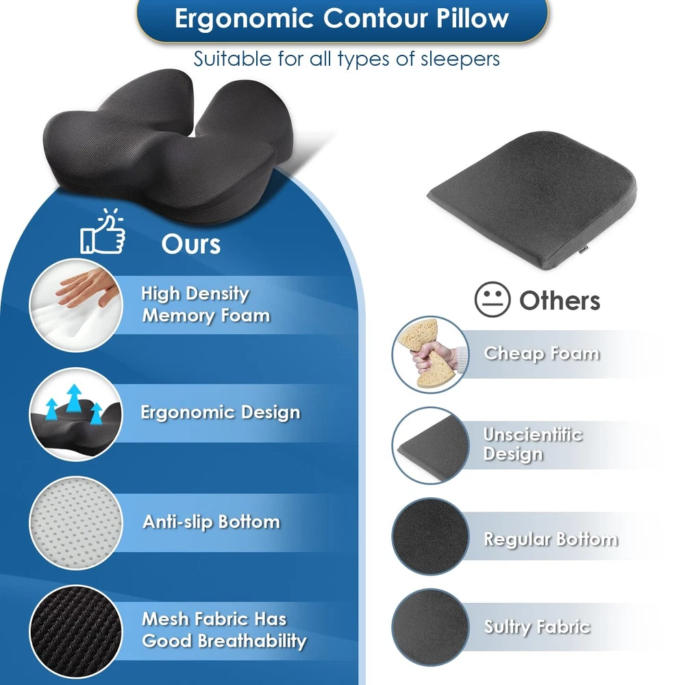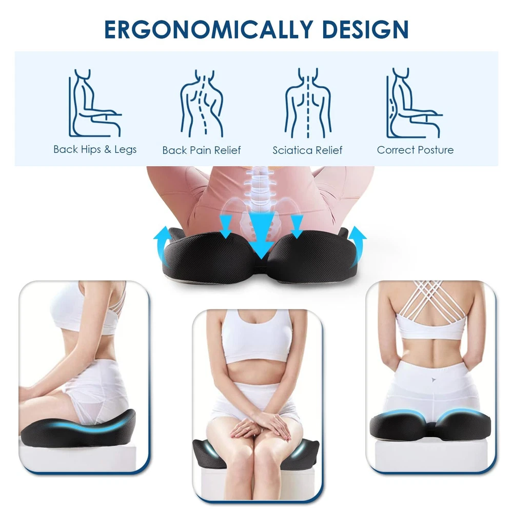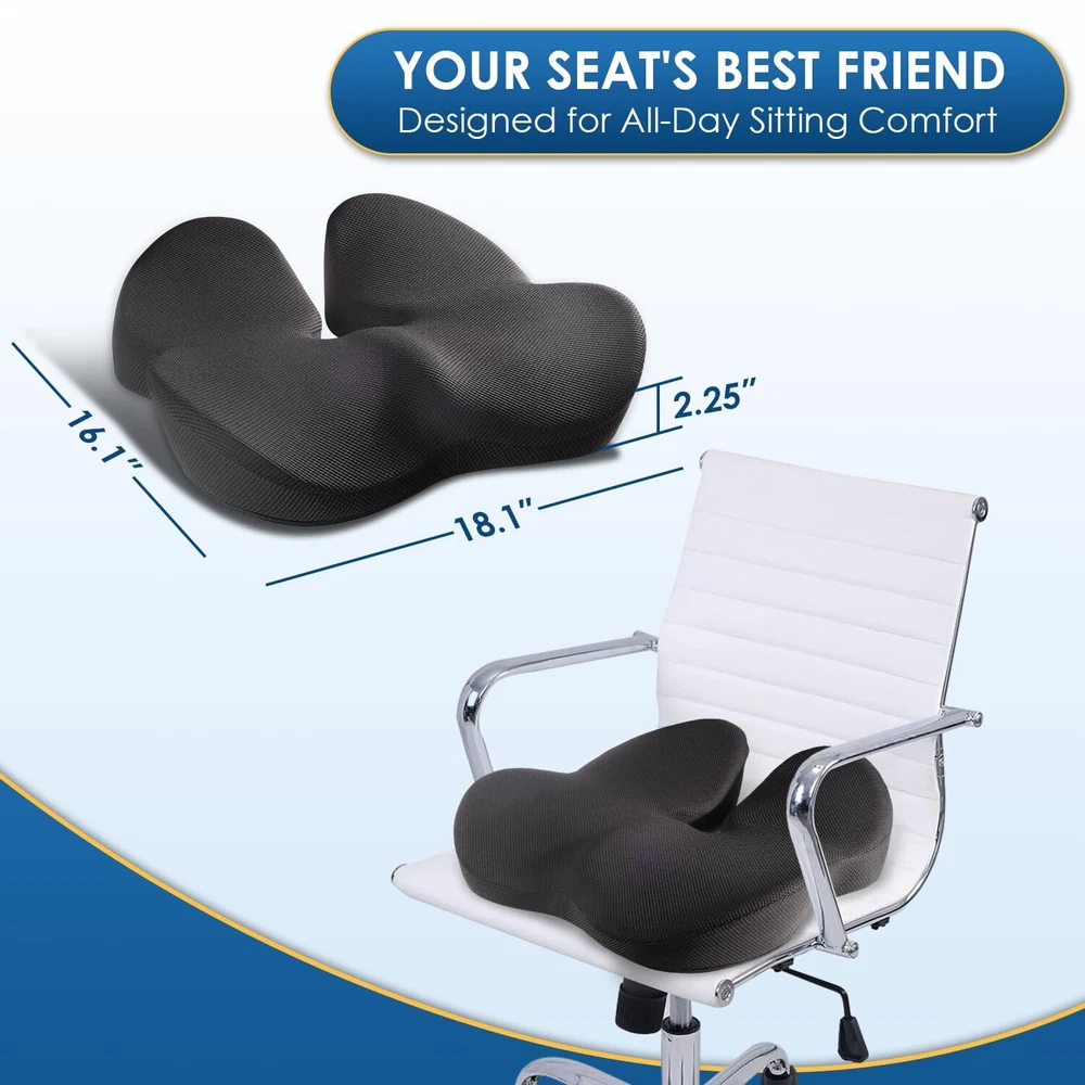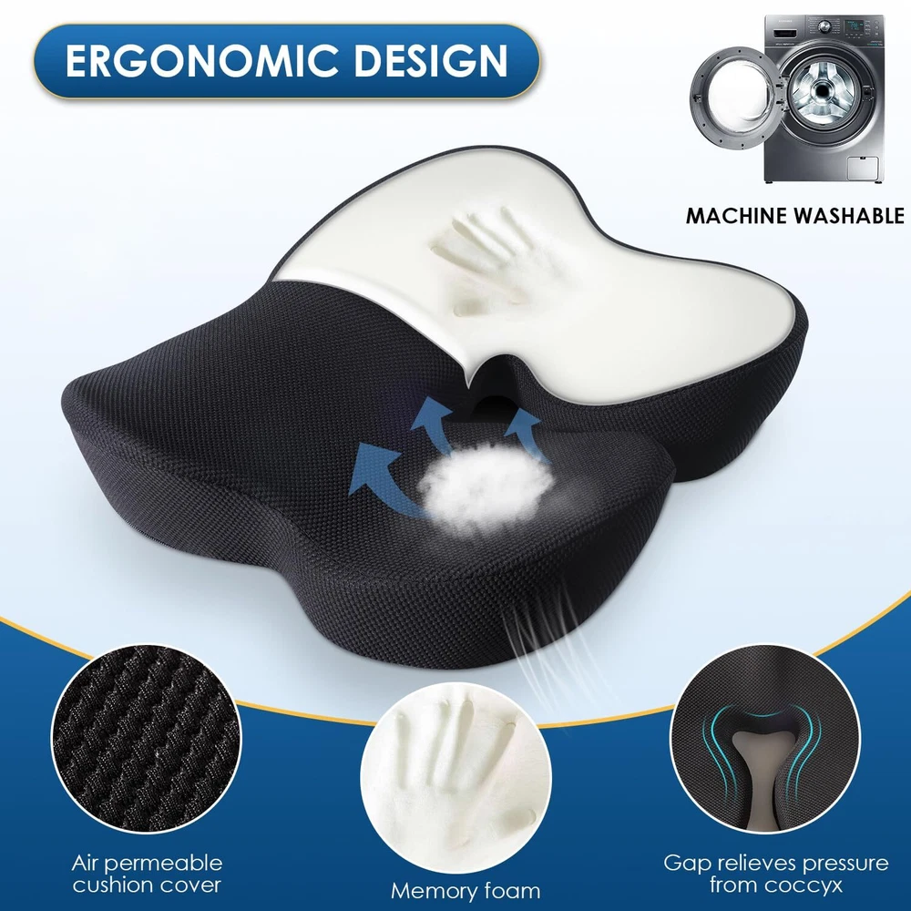 🏅【Patented Ergonomic Design for Comfort】Our memory foam seat cushion is patented design which can enhance your posture and cradle your thighs and hips. The seat cushion will provide comfort during long periods of sitting. 🏅【Premium Memory Foam】JUUWAN seat cushion for desk chair is made of high-density memory foam and features breathable black mesh cloth. The office chair cushion is certified by CertiPUR-US and approved by Oeko-Tex. 🏅【Relieves Pain and Improves Posture】The ergonomic shape of our cushion provides support and comfort while reducing pressure on your lower back, waist, and hips. The seat cushion for car also helps improve your posture, reducing the risk of pain and discomfort. 🏅【Versatile and Adaptable Design】The chair cushion is versatile and fits most chairs, making it perfect for use as a car seat cushion, desk chair cushion, sciatica pain relief cushion, gaming chair cushion, or chair cushion for back pain. 🏅【Easy to Clean and Non-Slip】The office chair cushion is designed with removable zippered cover, so it is easy to be cleaned. The bottom of the seat cushion for tailbone pain relief is made of non-slip material ,which can make the cushion stay in your chair without of moving around.