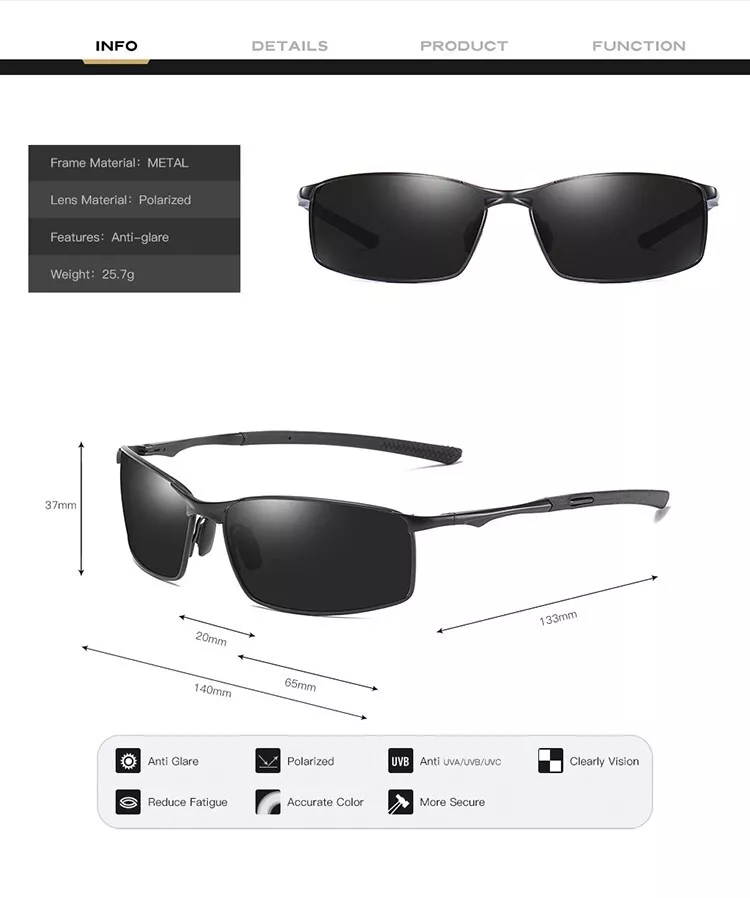 Product Description Description: Vintage Inspired Frame Design , these make them extremely stylish and stands out fashionably. The variety of color choices and better meet the needs of different designs. Durable Metal Frame and Reinforced Metal Hinges, Premium Resin lens make them unbreakable and shatter-proof. Well-made in details. UV lens can block 99%-100% of both UVA and UVB radiation. UV400 rated sunglasses are essential to protecting your eyes against long- term UV damage and keeping your eyes healthy. Besides Sunglasses, Hard Protection Box, Glasses Pouch, Cleaning soft fabric pouch included. Features: Polarized Metal frame Black/Blue color lens Anti-glare coating, Ideal for driving 100% UV protection coating , blocking 100% UVA and UVB sun-rays that are harmful to your eyes. Style Sunglasses for both Men & Women Comes with a FREE hard case for protection Slight adjustments to the shape of the sunglasses arms may be needed to get a custom fit. Adjustments should be made by a professional . Measurements: Lens width: 65 millimeters Lens height: 37 millimeters Bridge: 20 millimeters Arm/Temple: 133 millimeters Total Width: 140mm Package included: 1* Brand new Sunglasses 1* Hard Protection Case. 1* Carry Bag. 1* Clean Cloth NOTE: Due to the light and different computer monitors, the color maybe slight different as pictures. Also, please allow 1-3 cm measurement differ according to manual making. Your understanding and help are highly appreciated. Hope you can enjoy shopping here. About LENS The color of the lens can vary depending on style, fashion, and purpose, but for general use, red, grey, green, or brown are recommended to avoid or minimize color distortion, which could affect safety when, for instance, driving a car or a school bus. Gray and green lenses are considered neutral because they maintain true colors. Brown lenses cause some color distortion, but also increase contrast. Turquoise lenses are good for medium and high light conditions, because they are good at enhancing contrast, but do not cause significant color distortion. Yellow is "optimum for object definition, but creates a harsh visible light"; amber "allegedly makes distant objects appear more distinct, especially in snow or haze. These lenses are popular with skiers, hunters, boaters and pilots." Blue or purple lenses are mainly cosmetic. Tips & Warnings Always store your eyeglasses in a protective case to prevent scratches and prolong the life of your frames. Protect the lenses from smudges and scratches by using a micro fiber cloth to hold your glasses while making repairs. Be gentle when bending eyeglasses. Excessive force or frequent manipulation can break the frames or lenses. Be cautious when adjusting progressive glasses. Small adjustments can make a big difference in how these lenses perform. When in doubt use an optician to help adjust them properly.