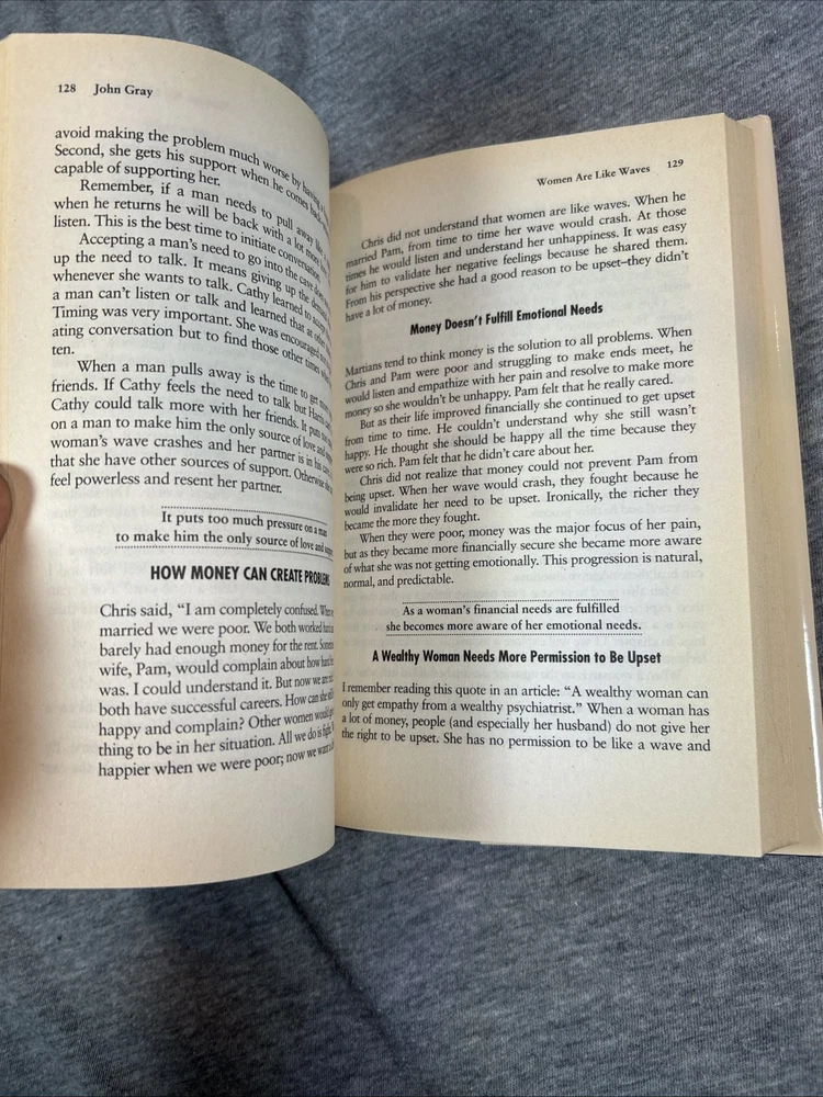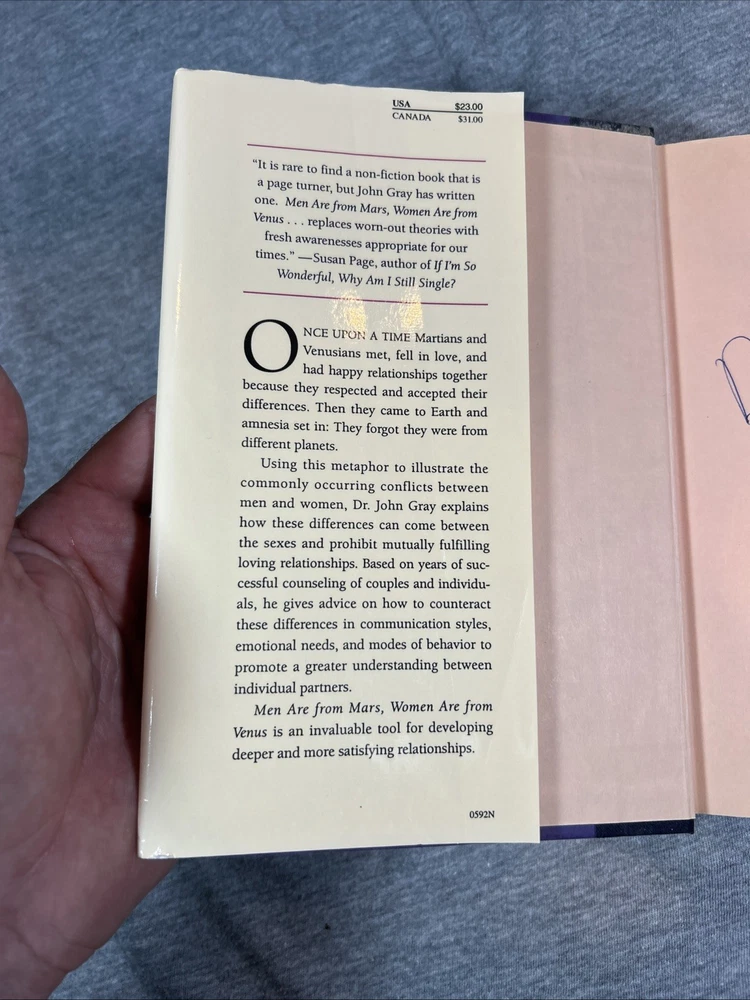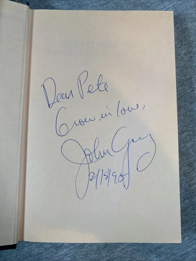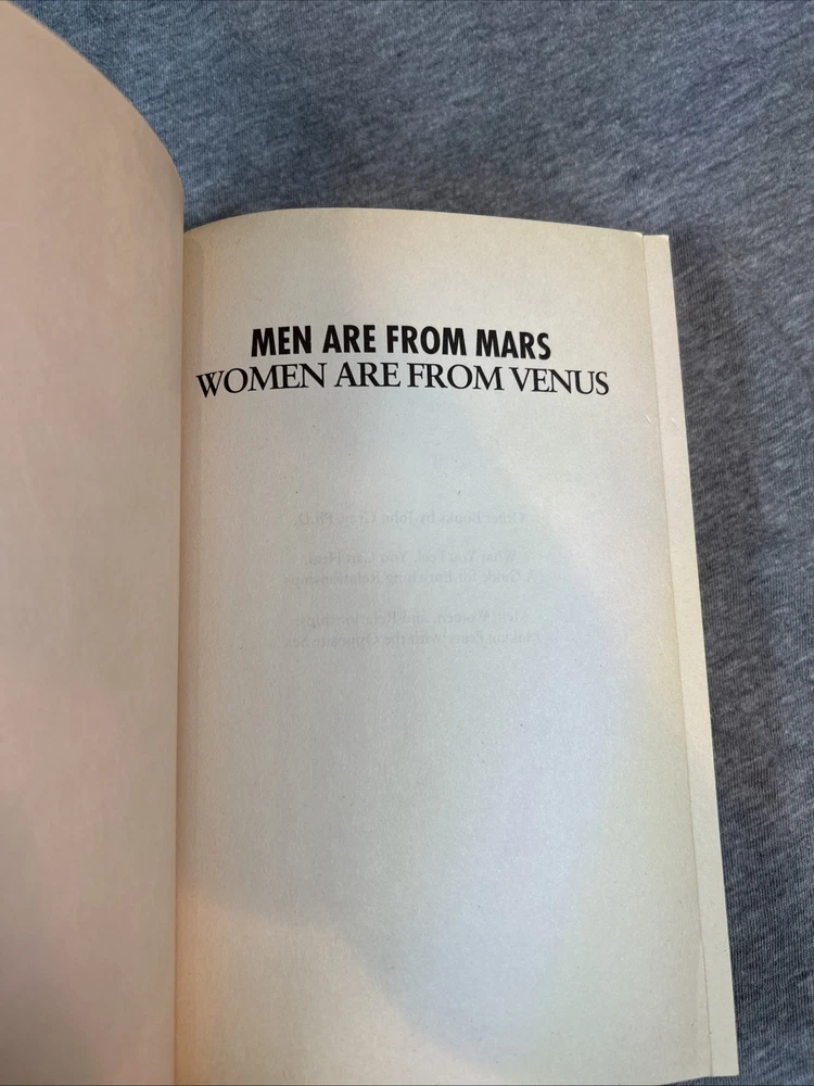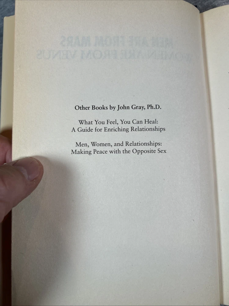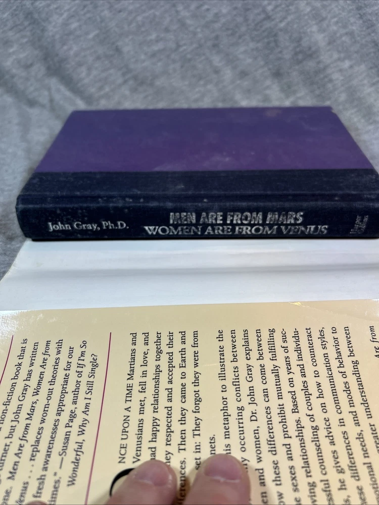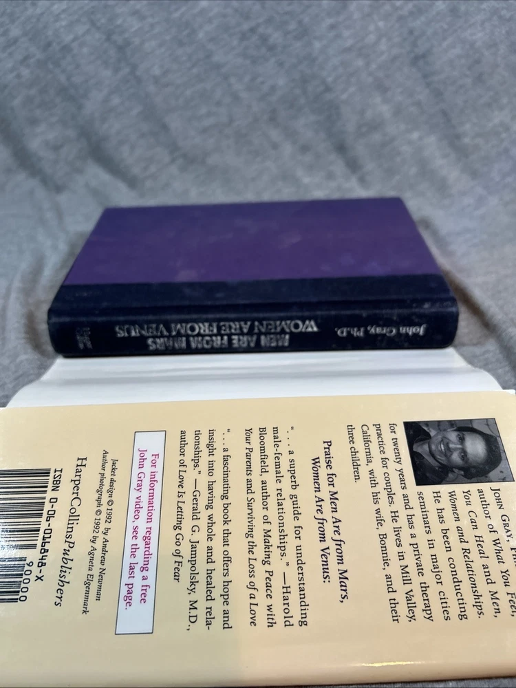 The product is a first edition hardcover book titled "Men Are from Mars Women Are from Venus" by John Gray, published by Harper Collins in 1992. It comes with a dust jacket and is an original print. The self-help book focuses on the topic of relationships between men and women, providing insights and guidance on understanding and improving communication and dynamics between the two genders. This collectible item is a valuable addition for those interested in personal growth and relationship advice.