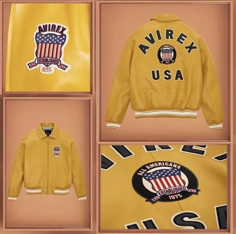 Note: PLEASE Share Your Size and Colour in Message. Thankyou Size: PLEASE READ THE SIZE GUIDE CAREFULLY. Please see the size chart image. Description: Men Avirex All colour Real Bomber American Flight Jacket Handmade designed, professionally cut and stitching throughout as per international standards. 100% genuine sheep skin leather. Soft , light weight, durable and comfortable. Key features: Premium Outer Shell: Made from 100% genuine Sheepskin leather, ensuring exceptional durability and a refined appearance. Comfortable Inner Lining: Features imported Cheer fabric for enhanced comfort and breath ability. Utility Pockets: Includes two exterior and two interior pockets for ample storage and convenience. Stylish Sleeves: Rib-knit cuffs provide a snug fit and a touch of classic bomber charm. Size Range: XS to 2XL (custom sizing available) Care Instructions: Dry clean only • Add this beautifully designed Real leather jacket to your winter attire.