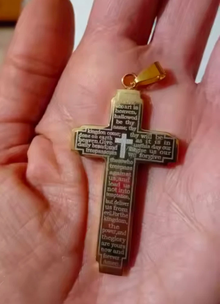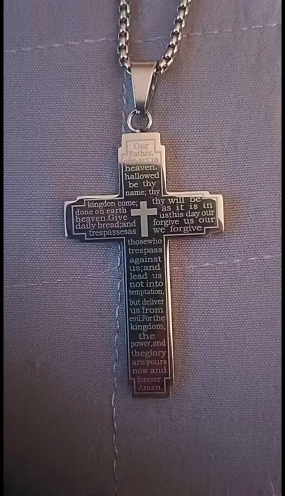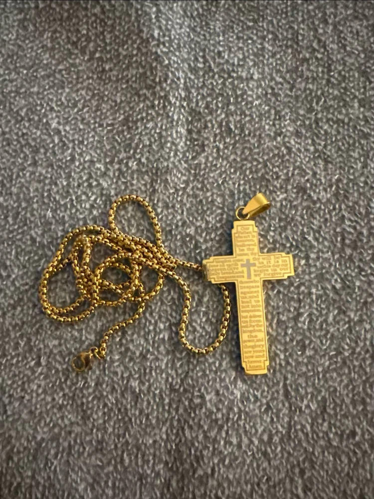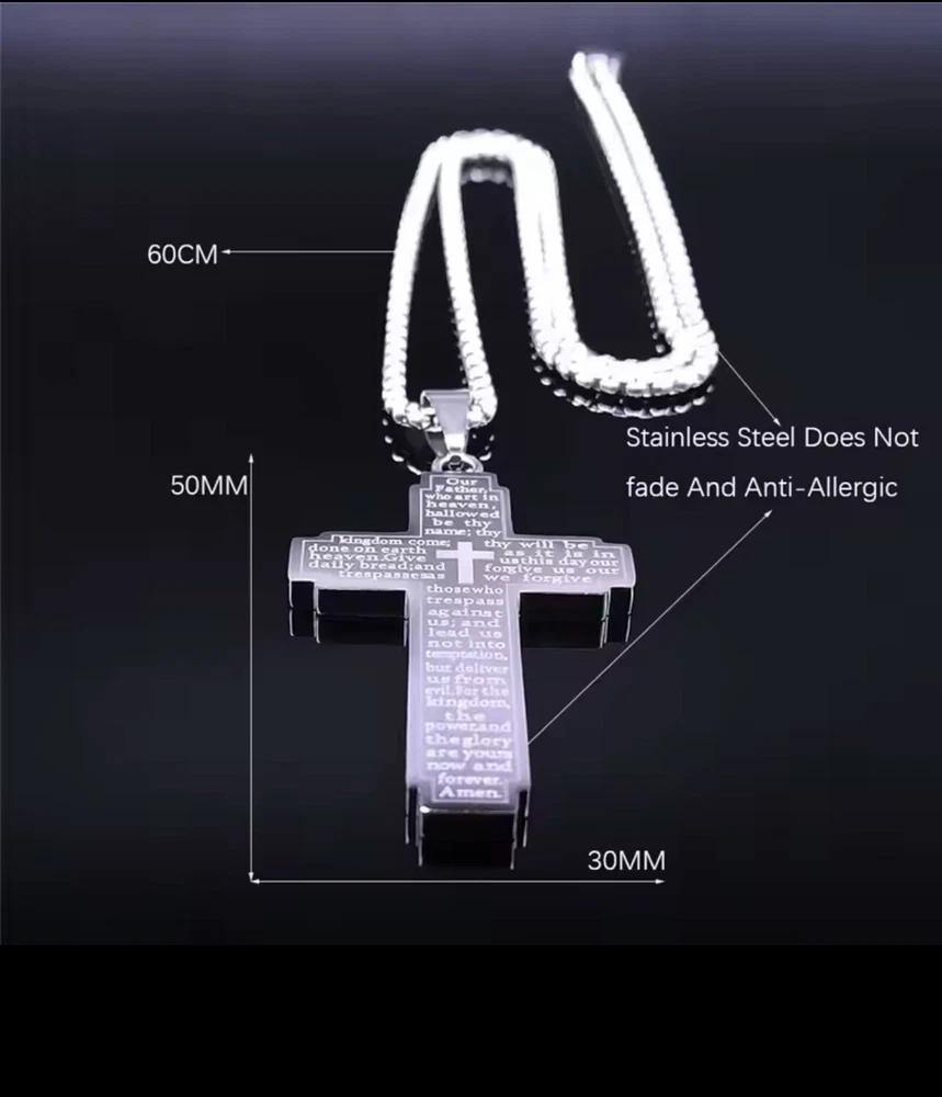This necklace is designed for men and boys, featuring a stainless steel cross pendant with the Lord's Prayer Bible inscription. The pendant is styled in a punk fashion, plated with multi-tone gold for a bold and edgy look. The necklace length is 24 inches, making it suitable for a variety of neck sizes. This accessory is a statement piece that combines religious symbolism with a modern and stylish design, perfect for those looking to add a touch of attitude to their outfit.