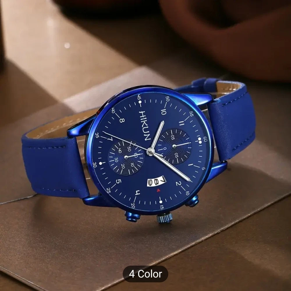 This is a new men's quartz wristwatch with a multicolor band made of stainless steel, leather, and metal. The watch features a blue case with a mineral crystal and luminous indexes. It has a self-winding movement and is water-resistant up to 10 meters. The dial displays Roman numerals, Arabic numerals, and square indexes. The watch comes with its original box and buckle closure.