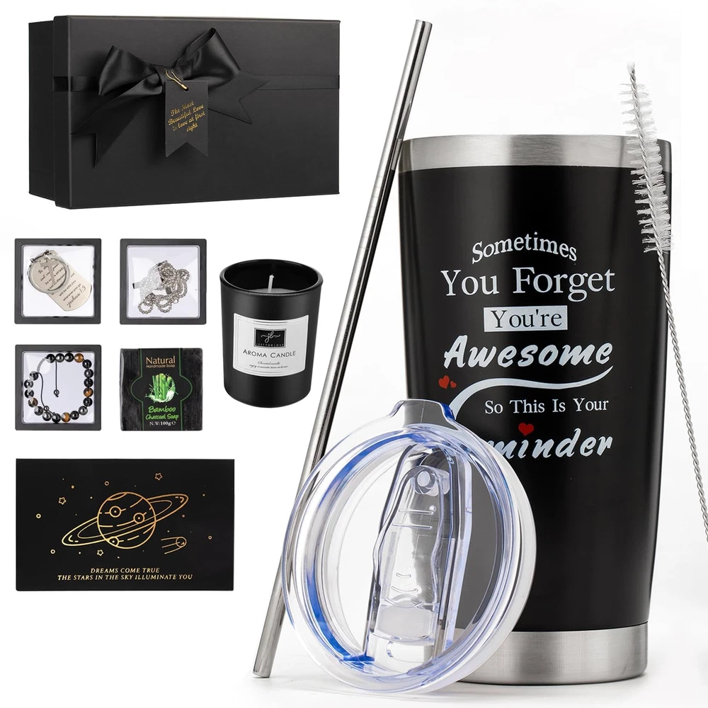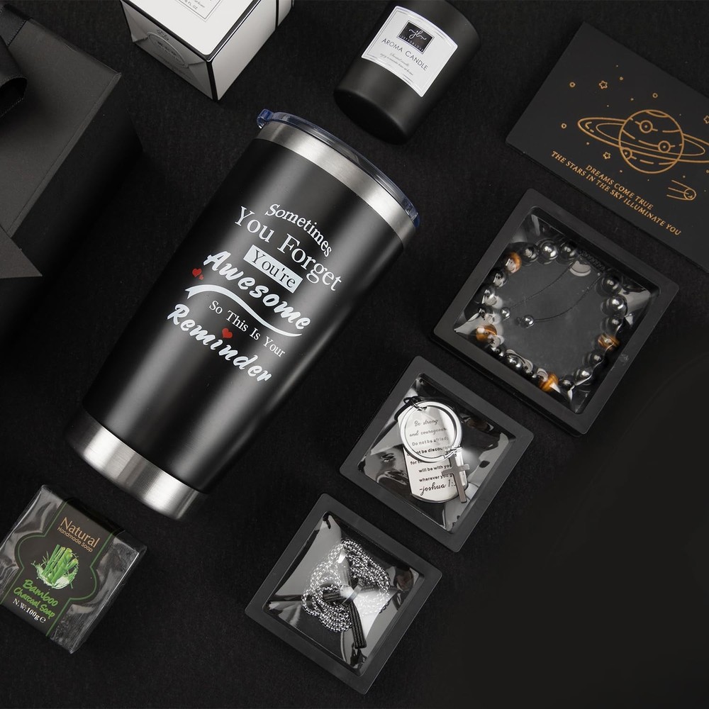 Birthday Gifts for Men,Father's Day Gift Man Gifts Basket Ideas Set for Him,Men's Birthday Gift Box Presents for Dad, Husband, Brother, Son, Boyfriend, Friend, Male, Coworker Retirement Gifts Box 【Gift Box Package】:The gifts set comes with Insulated Tumbler , Men's Bracelet,Pure Manual Soap ,Scented Candle,Cross Necklace,Keychain,Greeting Card, Exquisite gift box and some accessories such as lid, straws. This men gift set is a wonderful gift to satisfy your giving gift needs and the practical dad gifts set will make him happy and heat- warming. 【 Lucky Bracelets】: These bracelets are made of natural stone beads with excellent high luster and natural color. The natural stone bead possess low density, lightweight for people to wear.The bracelet is a symbol of good fortune.Its high-quality rope construction ensures durability, while the adjustable length makes it a perfect fit for any wrist. 【High Quality Tumbler】:Our tumblers are made of stainless steel material, the double walled vacuum insulated design maintains the suitable temperature for his favorite drinks for hours.Our stainless steel travel tumbler is not only suitable for many outdoor or indoor occasions such as home, office, picnic, hiking, fishing. 【Scented Candle for Relaxation】: Our scented candle is designed to create a calm and serene environment; The pleasant fragrance will help him unwind after a long day, making it an ideal part of his relaxation routine. 【Man Gifts for Dad Who Has Everything】:If you are looking for a Curated Man Christmas Gift, our Gift Box is an elegant package that comes with practical gifts for men. Our box filled with love and thanks can brighten up a memorable Christmas, may it be your dad, papa, grandpa, husband, stepfather, or father-in-law. 【Best Gifts for Men On Any Occasion】:This funny gift basket for men is a thoughtful gift for any celebration. Hand it out during birthdays, Christmas, Thanksgiving, or any other day of the year! When he receive the mens gifts he will deeply feel your love!That Would Remind Him of you every time when he uses the mens gift.