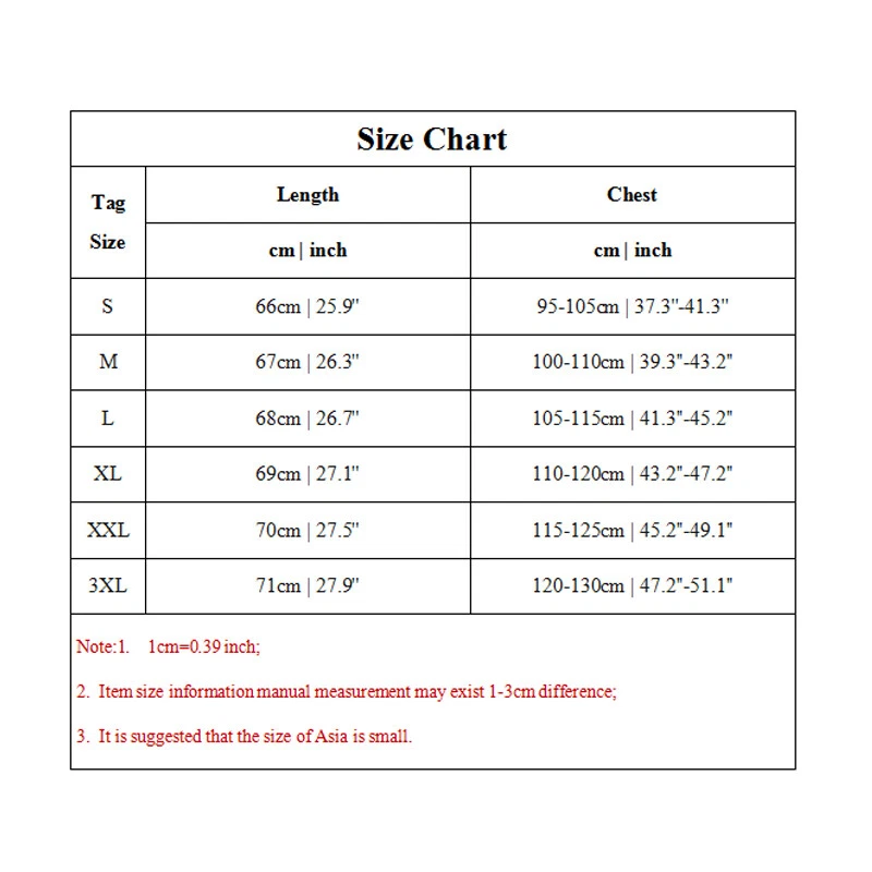Specifications: 100% Brand new and high quality. Size:S,M,L,XL,XXL,3XL Color: white Material: Polyester Sleeve length:sleeveless Neckline:round neck Pattern:solid color Season:summer 1.Due to the light and screen difference, the item's color may be slightly different from the pictures. Please understand. 2.Please allow 2-3% error due to manual measurement.Please make sure you don’t mind before you mid. 3.Size doesn’t fit all.Please carefully check size chart and select the size based on your real size. Care Instructions: Wash before wear Cold gentle machine wash Do not bleach Do not tumble dry Drip dry Package:1 pcs men vest Asian Size , Runs Small, Please Size Up ! Size Chart Tag Size Length Chest cm | inch cm | inch S 66cm | 25.9'' 95-105cm | 37.3''-41.3'' M 67cm | 26.3'' 100-110cm | 39.3''-43.2'' L 68cm | 26.7'' 105-115cm | 41.3''-45.2'' XL 69cm | 27.1'' 110-120cm | 43.2''-47.2'' XXL 70cm | 27.5'' 115-125cm | 45.2''-49.1'' 3XL 71cm | 27.9'' 120-130cm | 47.2''-51.1'' Note:1. 1cm=0.39 inch; 2. Item size information manual measurement may exist 1-3cm difference; 3. It is suggested that the size of Asia is small.