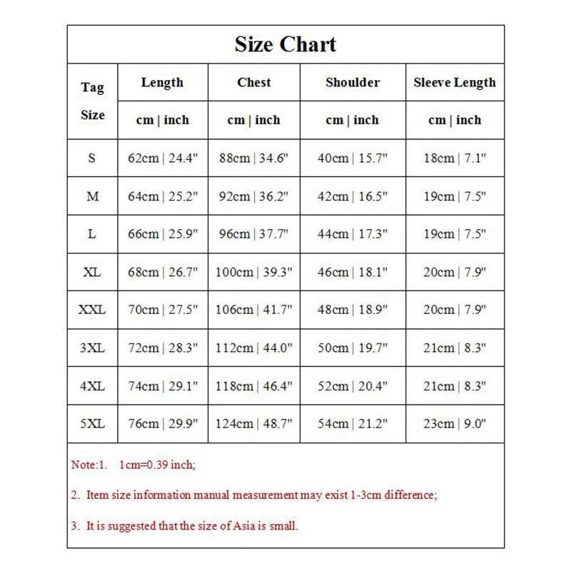 Specifications: 100% Brand new and high quality. Size:S,M,L,XL,XXL,3XL,4XL,5XL Color: as show Material: Polyester Sleeve length:short sleeve Neckline:round neck Pattern:Muscle Tattoo Print Season:summer Note: 1.Due to the light and screen difference, the item's color may be slightly different from the pictures. Please understand. 2.Please allow 2-3% error due to manual measurement.Please make sure you don’t mind before you mid. 3.Size doesn’t fit all.Please carefully check size chart and select the size based on your real size. Care Instructions: Wash before wear Cold gentle machine wash Do not bleach Do not tumble dry Drip dry Package:1 pcs men t shirt Size Chart Tag Size Length Chest Shoulder Sleeve Length cm | inch cm | inch cm | inch cm | inch S 62cm | 24.4'' 88cm | 34.6'' 40cm | 15.7'' 18cm | 7.1'' M 64cm | 25.2'' 92cm | 36.2'' 42cm | 16.5'' 19cm | 7.5'' L 66cm | 25.9'' 96cm | 37.7'' 44cm | 17.3'' 19cm | 7.5'' XL 68cm | 26.7'' 100cm | 39.3'' 46cm | 18.1'' 20cm | 7.9'' XXL 70cm | 27.5'' 106cm | 41.7'' 48cm | 18.9'' 20cm | 7.9'' 3XL 72cm | 28.3'' 112cm | 44.0'' 50cm | 19.7'' 21cm | 8.3'' 4XL 74cm | 29.1'' 118cm | 46.4'' 52cm | 20.4'' 21cm | 8.3'' 5XL 76cm | 29.9'' 124cm | 48.7'' 54cm | 21.2'' 23cm | 9.0'' Note:1. 1cm=0.39 inch; 2. Item size information manual measurement may exist 1-3cm difference; 3. It is suggested that the size of Asia is small.