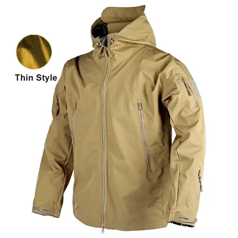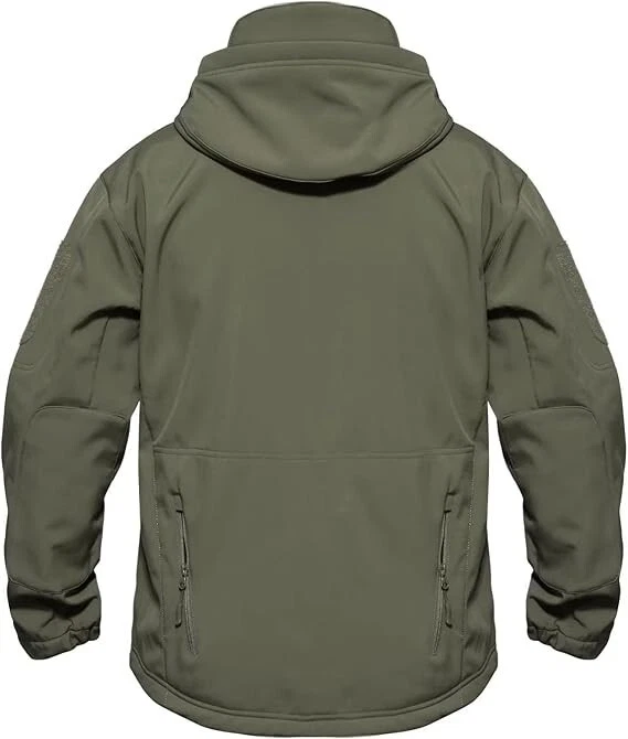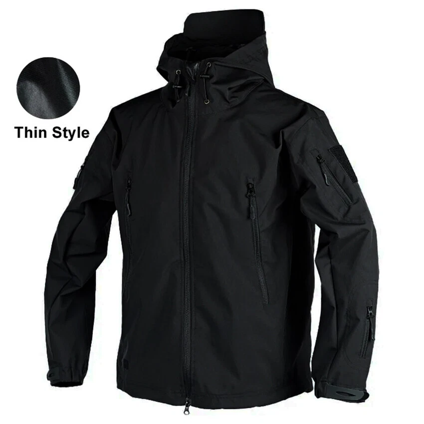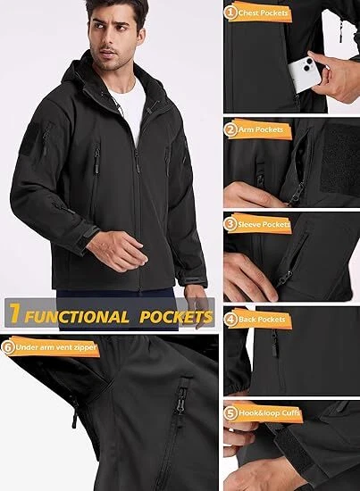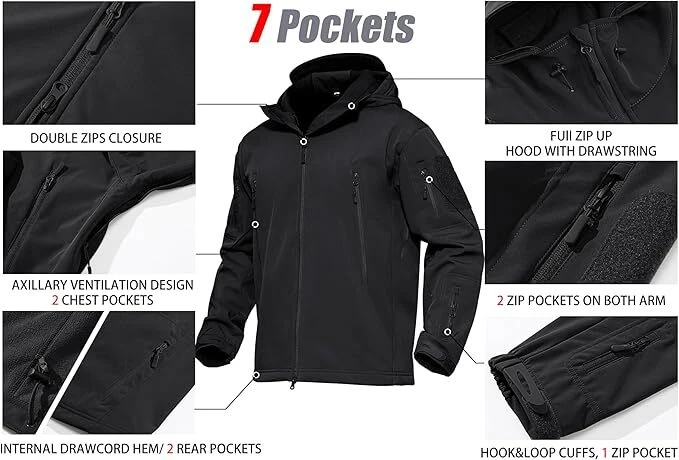 Product Description Classic tactical jacket, comfortable for all outdoor activities. it can keep you dry in the small rain and snow, also block all wind and keep the cold air out. Flexible & Multi-function. 100% polyester soft shell fabric, with thermal fleece liner, keep you pretty warm in winter. Waterproof & Windproof; Men's Clothes Zipper; Huge hood can be roll up; Two way zip up to open or close; Under arm vent zippers; Hook & loop adjustable wrist cuff; Drawstring waist and hood; Large loop on both arm for individuality patches. Tactical multi-Pockets design: 2 large zippered chest pockets; 2 back pockets; 2 small pockets on left arm and 1 small pockets on left sleeve. Good for winter, autumn and spring. Great for outdoor sport, hunting, fishing, hiking, climbing, camping, travelling, motorcycle, cycling, work and casual wear. Model Show Applicable scene