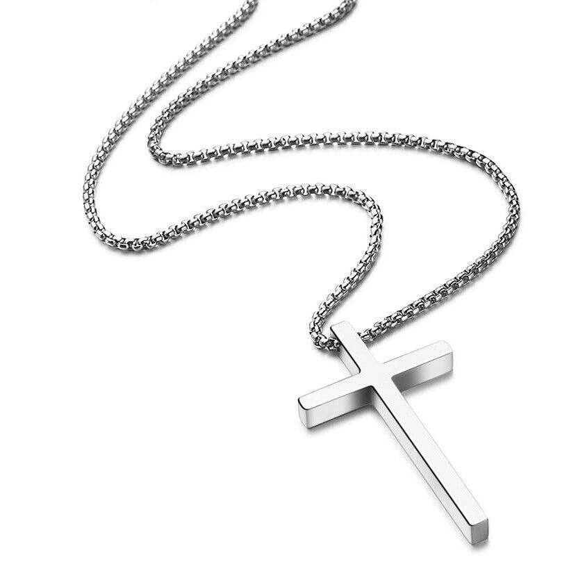 Men Women Cross Necklace Stainless Steel Simple Silver Pendant Box Chain Gift