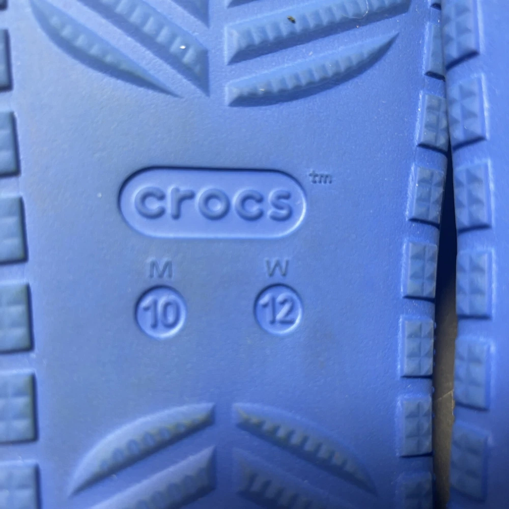 These Crocs slides are unisex and come in a blue color, suitable for both men and women. Designed with a slip-on and a round toe shape, they are perfect for casual wear and travel. With a solid pattern and a comfortable rubber outsole, these slides are great for outdoor activities and sports. The size is suitable for a men's 10 or women's 12, featuring a foam insole and a synthetic lining for added comfort. Ideal for the summer, fall, and spring seasons, these Crocs slides offer a stylish and practical option for everyday wear.
