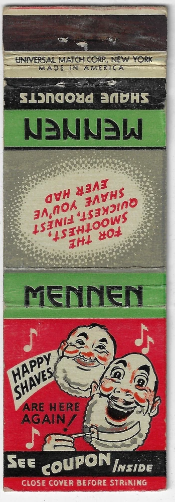 Mennen Shave Products Coupon Inside FS Empty Matchbook Cover Note the condition from the high resolution scans. The striker has been used overall the cover is in excellent condition with very minor wear. NO MATCHES IN THIS SALE COVER ONLY Your purchase will be sent by First Class Letter with tracking