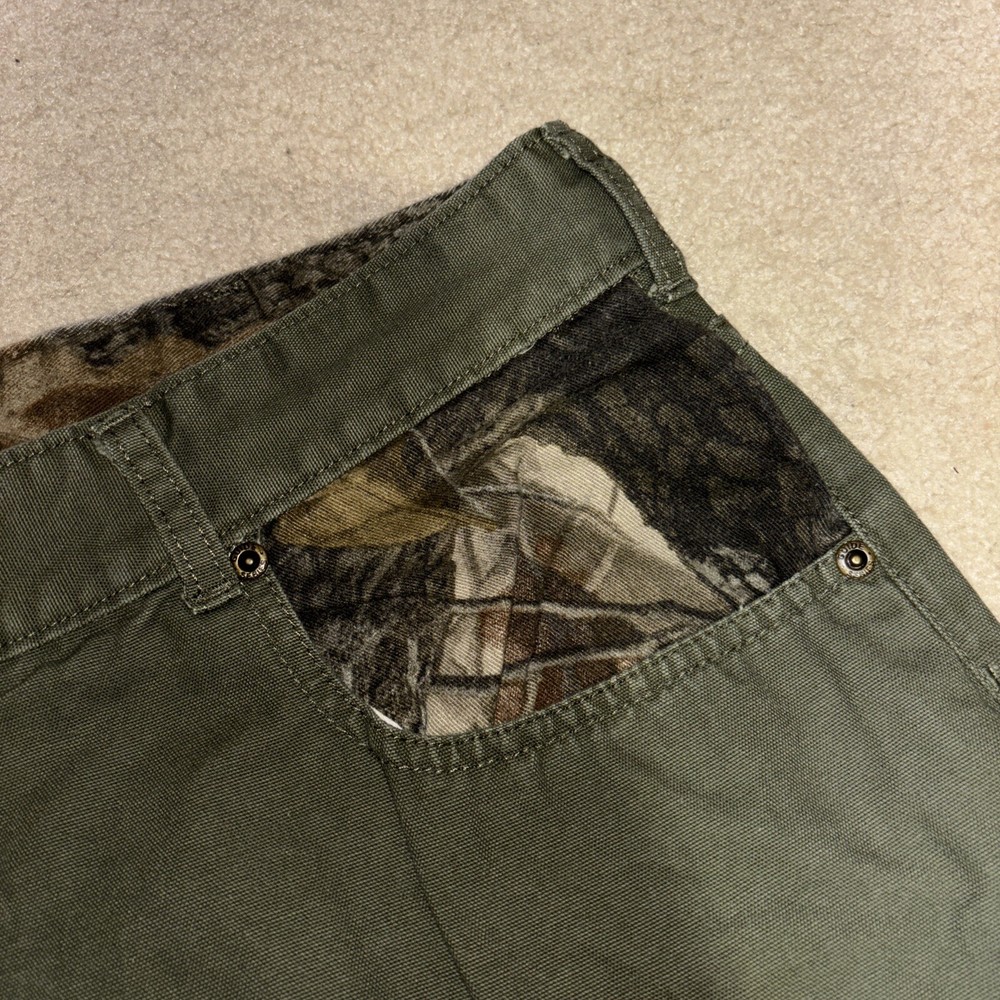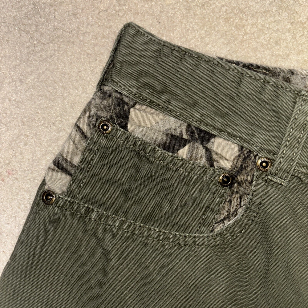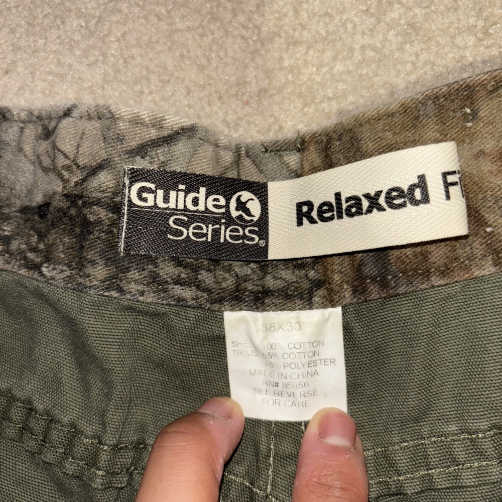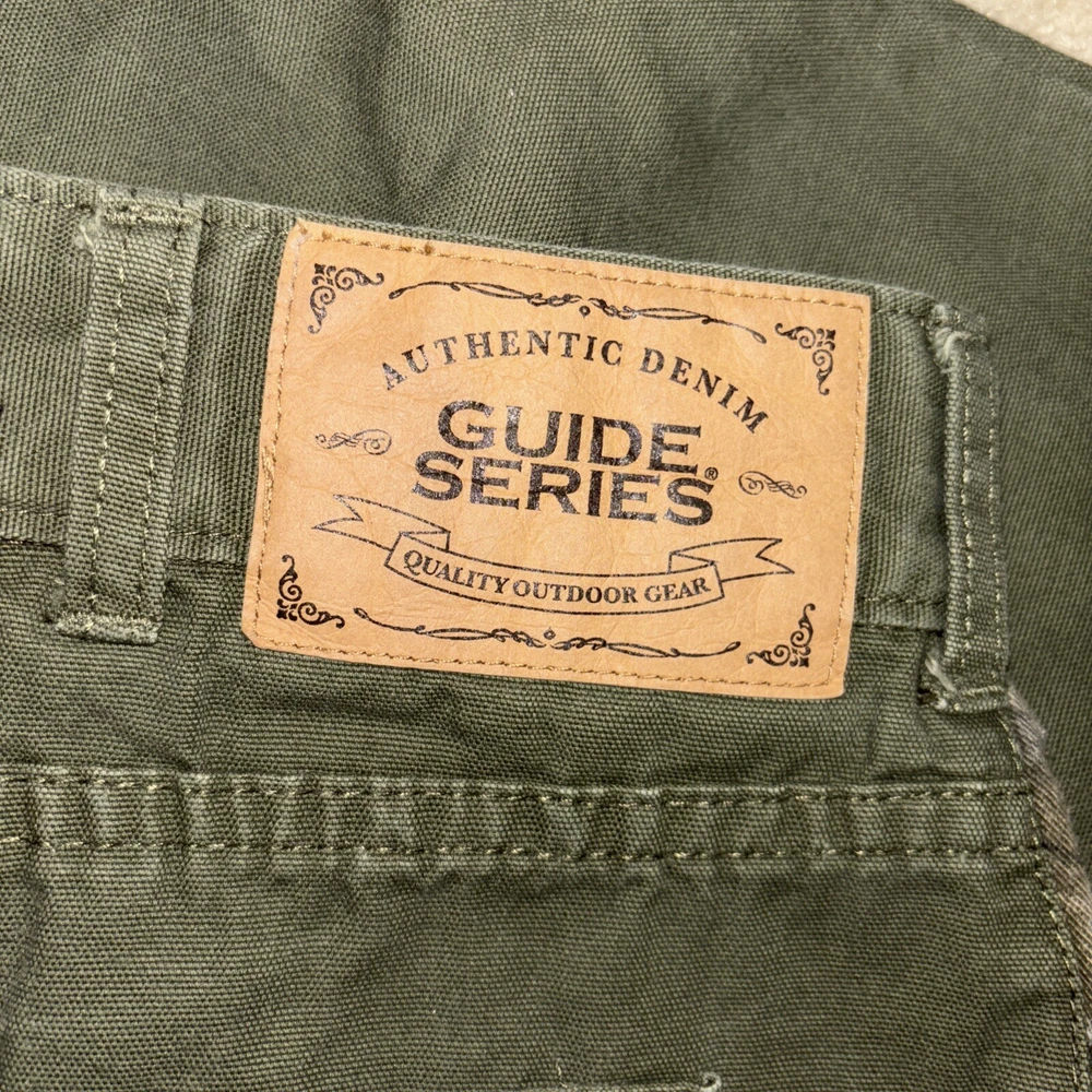 These Guide Series pants are designed for men in a relaxed fit with a waist size of 38 inches and inseam of 30 inches. The pants feature a solid green color in a classic carpenter style with cargo pockets for added convenience. Made of cotton canvas material, they have a zip closure and a flat front design with a mid-rise. The pants also have button accents and are machine washable, making them suitable for travel and casual wear.