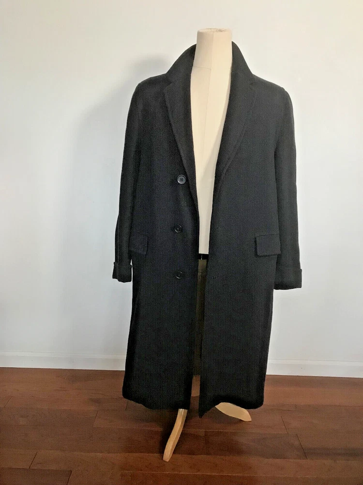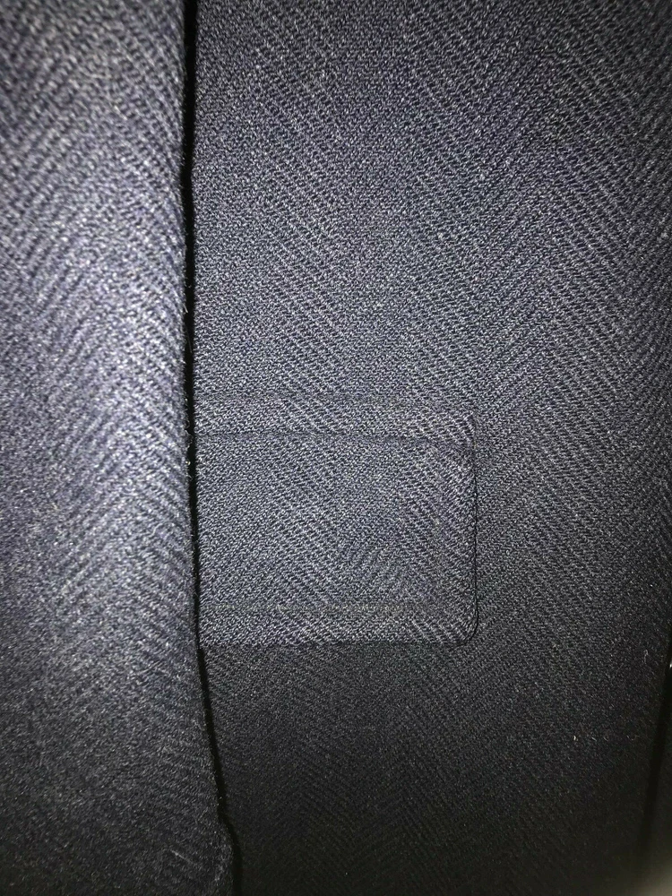 1960 British topcoat JAEGER reknowned maker of men's wear Dark Blue Gentleman's overcoat Size 44 note British size 44 made to accomodate sweater or jacket (thus chest 48 inch + to accomodated sweater or tweed jacket and drape properly.) Jaeger heavywieght tweed chevron in ex. vintage condition. No rips no moth work and little wear evident partial lining good condition. the blue is so dark it is difficult to photograph. sleeves are beautifully cuffed, note gathering of material at shoulder (which is unpadded), typical of higher end tailoring of the period. no wear to the bottom hem, back shoulder one side has ancient repair to 1/2 cm of wear. Overcoat is VINTAGE, c.1959 - 60. Length back collar to hem= 47 inches approx shoulder to shoulder between 20 - 21 inches Chest 44 - 48 across front Shoulder to end sleeve 26 + inches Under arm to end sleeve 18 + inches
