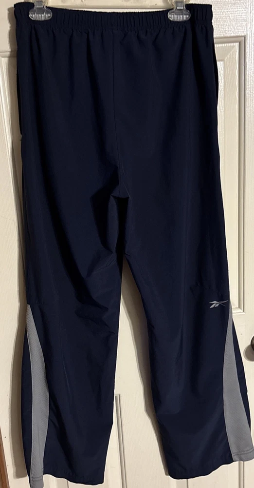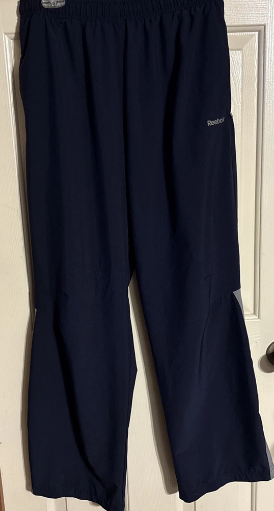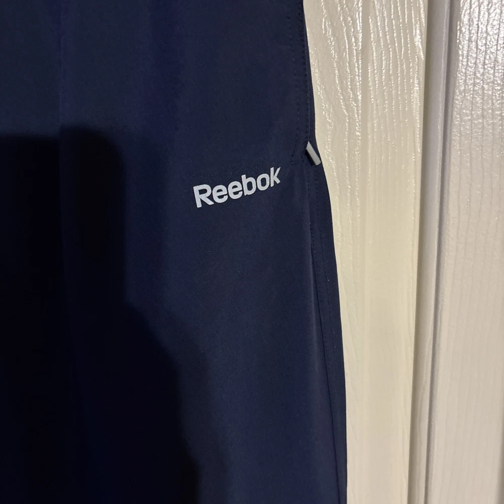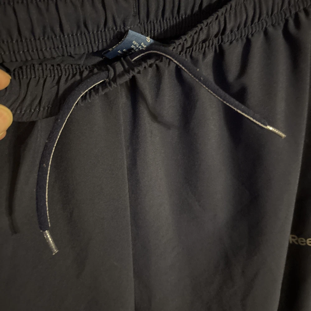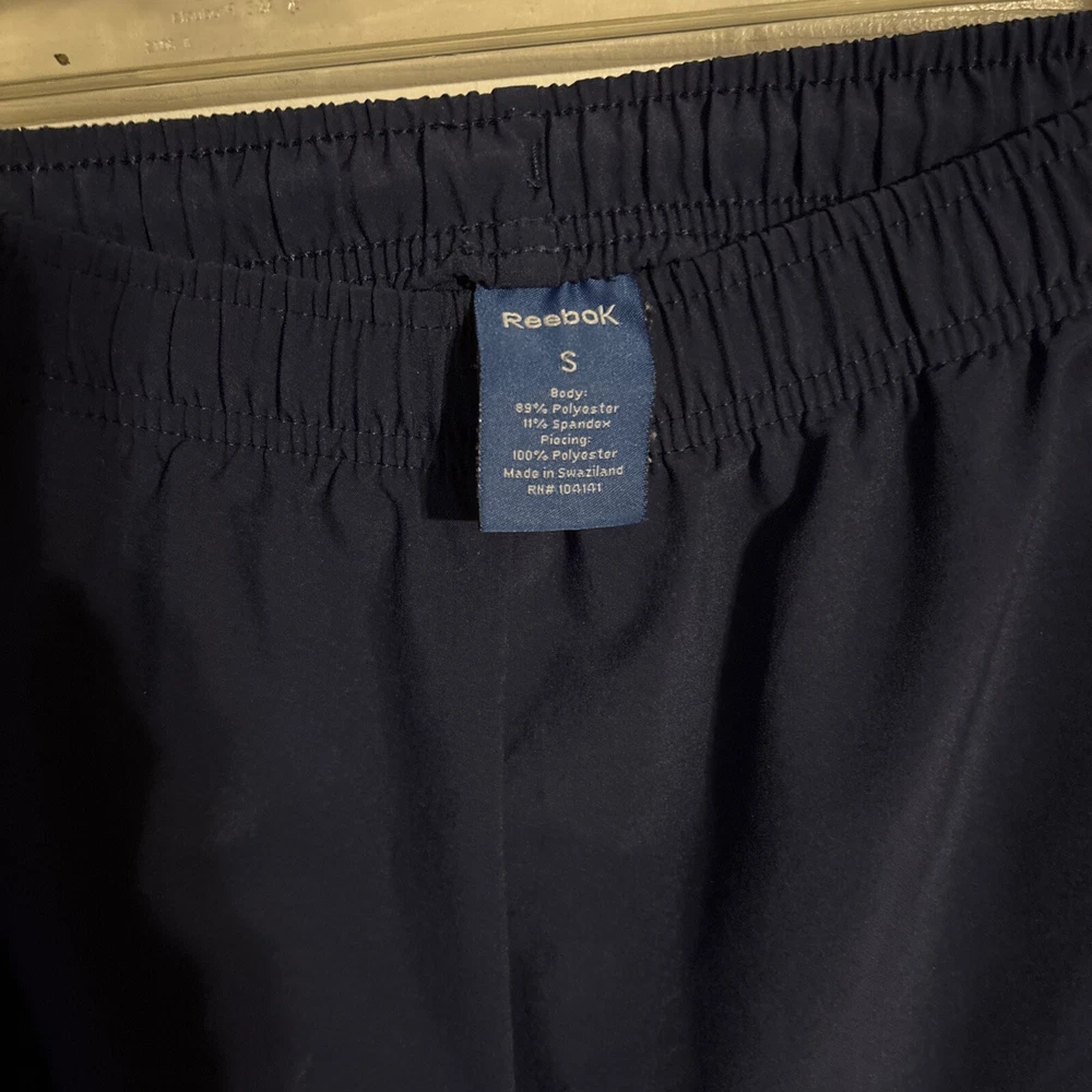 Men's Reebok Active Wear Pants in size Small. These navy blue Track Pants feature a drawstring closure, lined interior, elastic waist, and side zip pocket. Designed for gym training, cross-training, and running, these pants are a comfortable and stylish choice for men's activewear. Made in Eswatini. Inseam: 29” International charges are the buyer’s responsibility. No international returns.