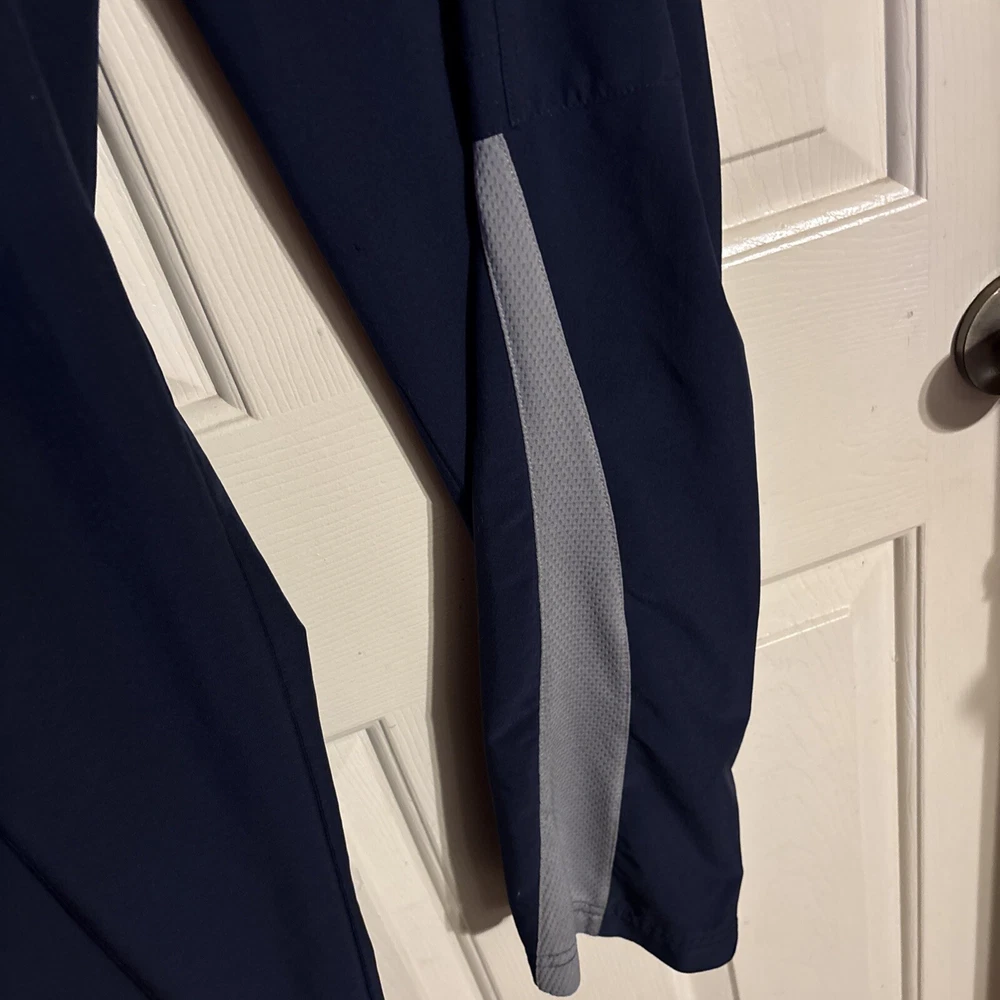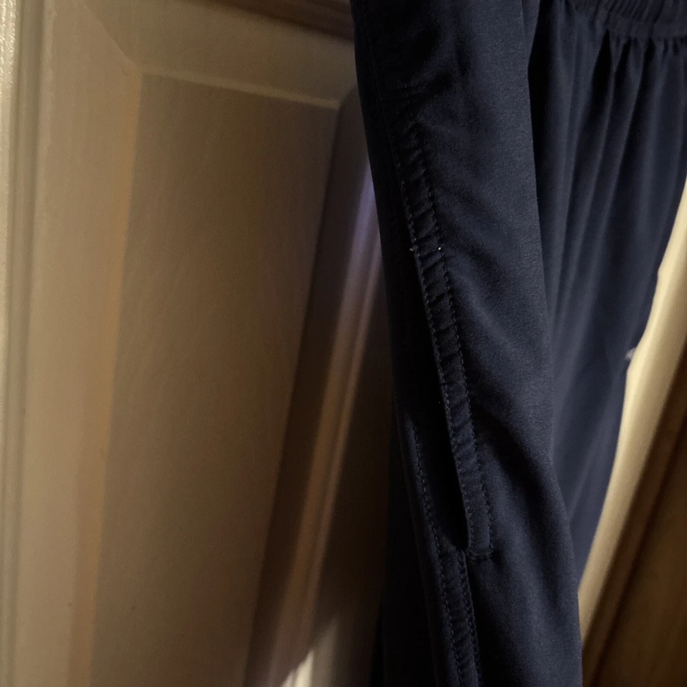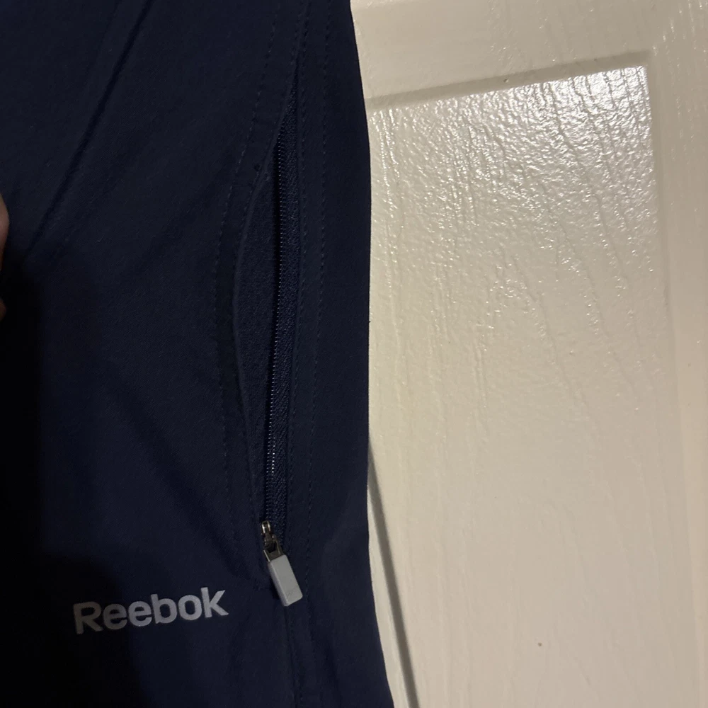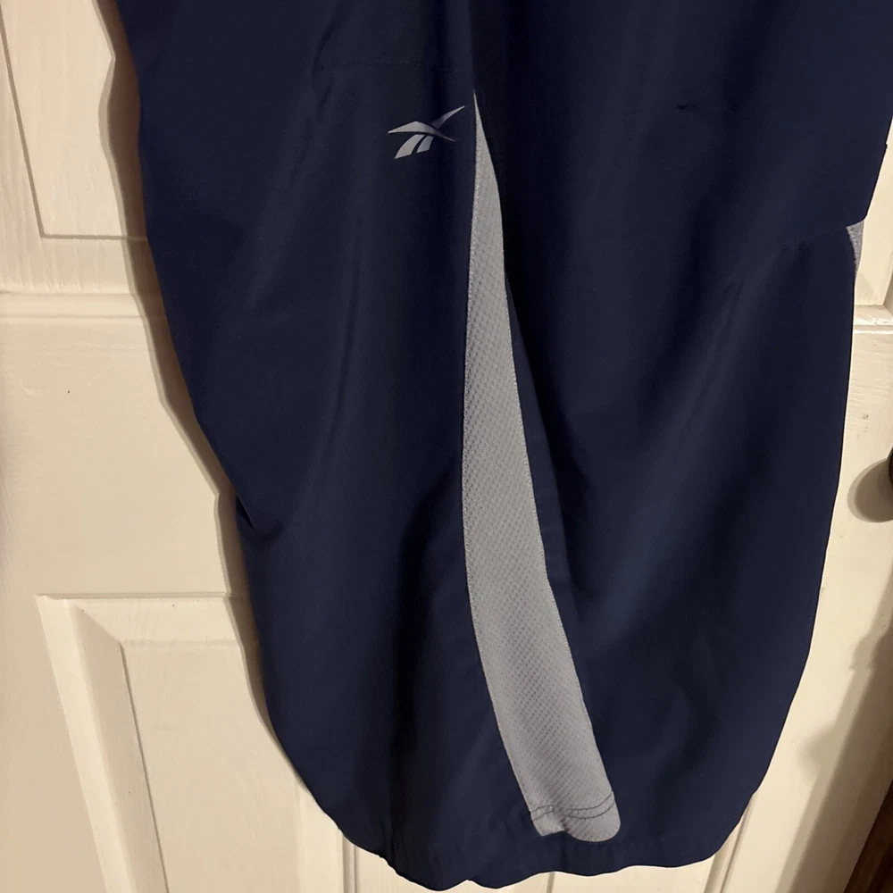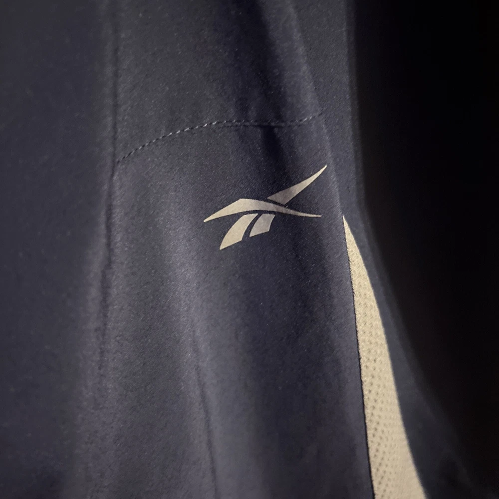 Men's Reebok Active Wear Pants in size Small. These navy blue Track Pants feature a drawstring closure, lined interior, elastic waist, and side zip pocket. Designed for gym training, cross-training, and running, these pants are a comfortable and stylish choice for men's activewear. Made in Eswatini. Inseam: 29” International charges are the buyer’s responsibility. No international returns.