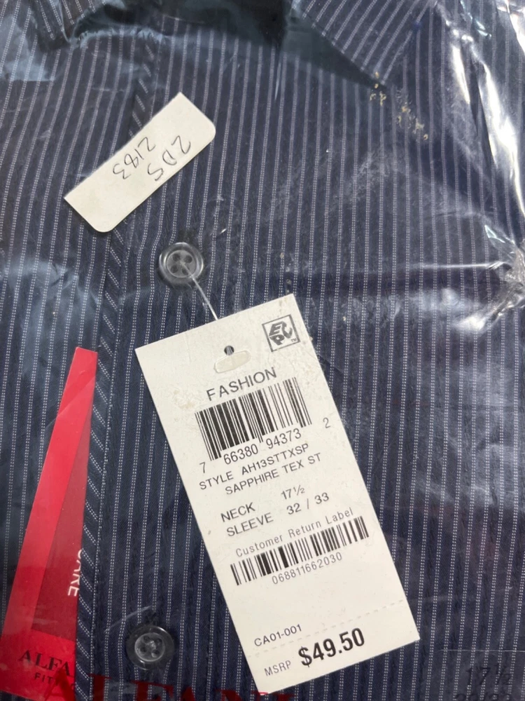 The product is a men's Alfani dress shirt in size 17.5, with a 32/33 sleeve length. It is a regular fit shirt designed for formal or business attire. The Alfani brand is known for producing high-quality clothing items, making this dress shirt a stylish and professional option for men looking to enhance their wardrobe.