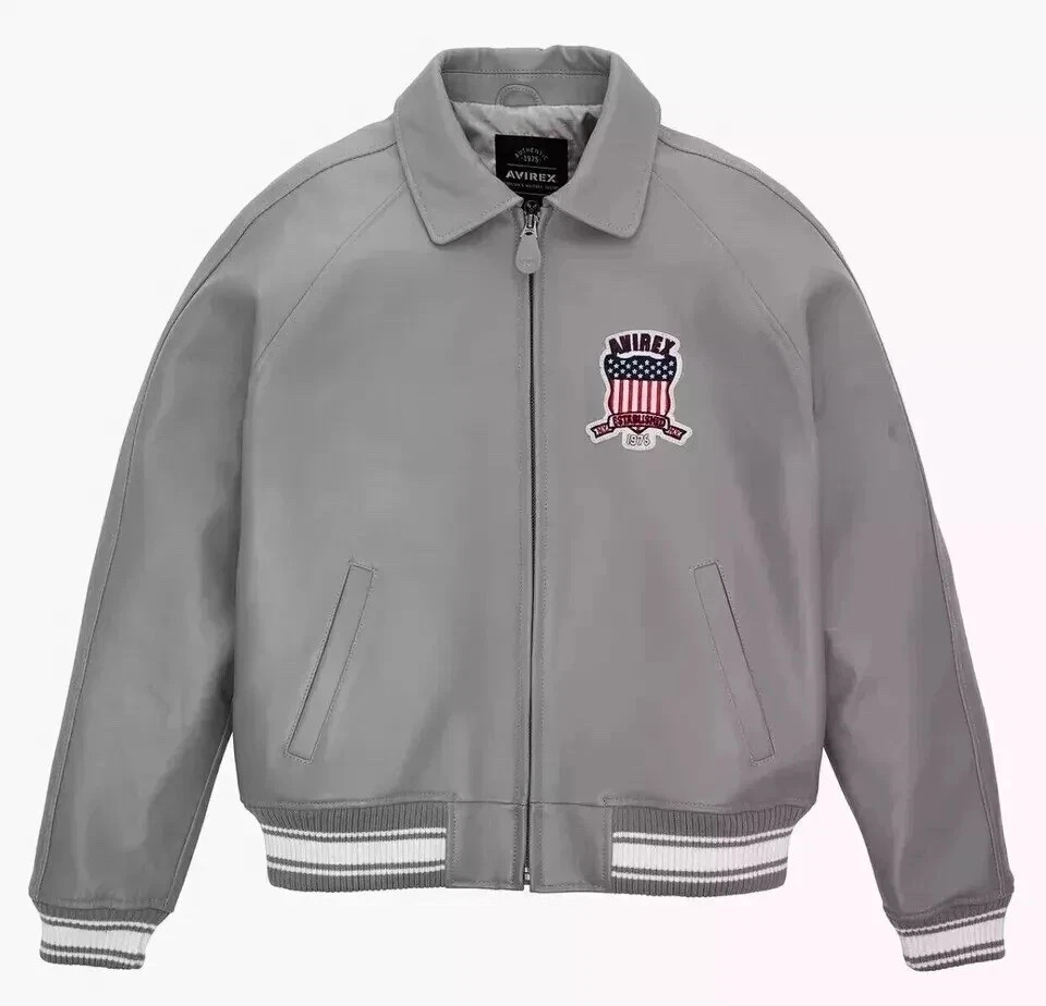 The Men's Avirex USA American Bomber Flight Genuine Cowhide Leather Jacket in Grey is a stylish and high-quality outerwear piece perfect for travel and casual occasions. Made with genuine cowhide leather and featuring a zip closure, this bomber jacket has a vintage-inspired design with a spread collar and mid-length cut. The jacket is handmade with attention to detail, including a satin fabric type and accents like zipper closures. With a solid gre grey color and a USA theme, this jacket is both fashionable and functional, ideal for the winter, fall, and spring seasons. Perfect for men who appreciate quality craftsmanship and timeless style.