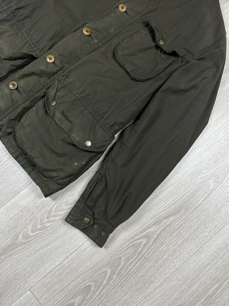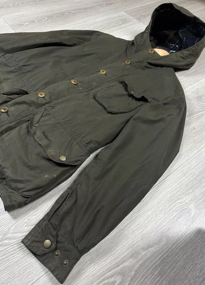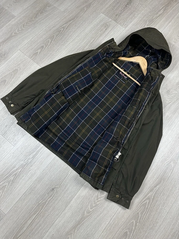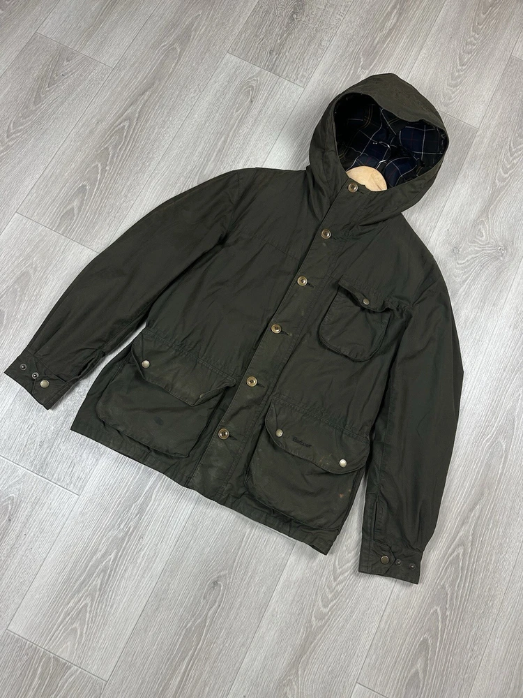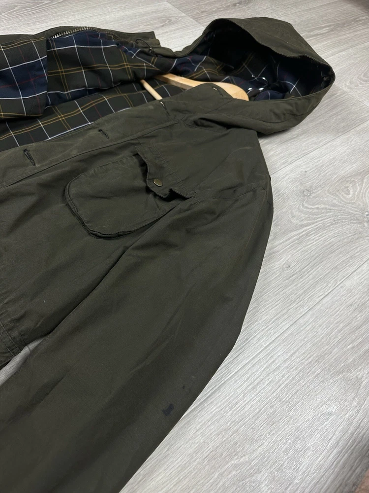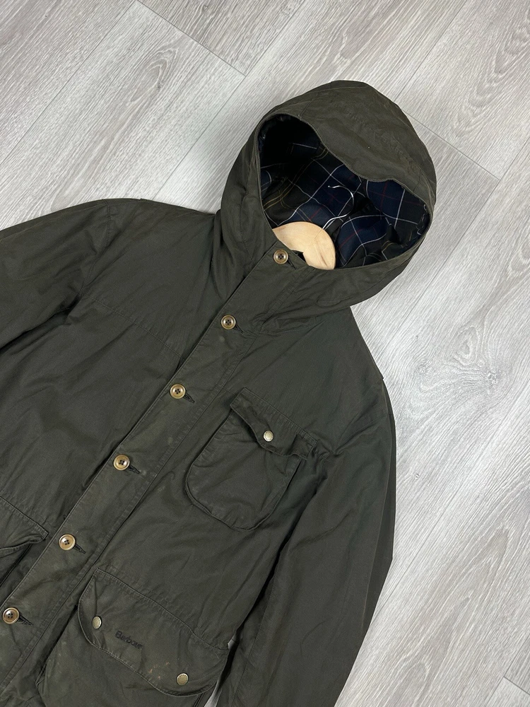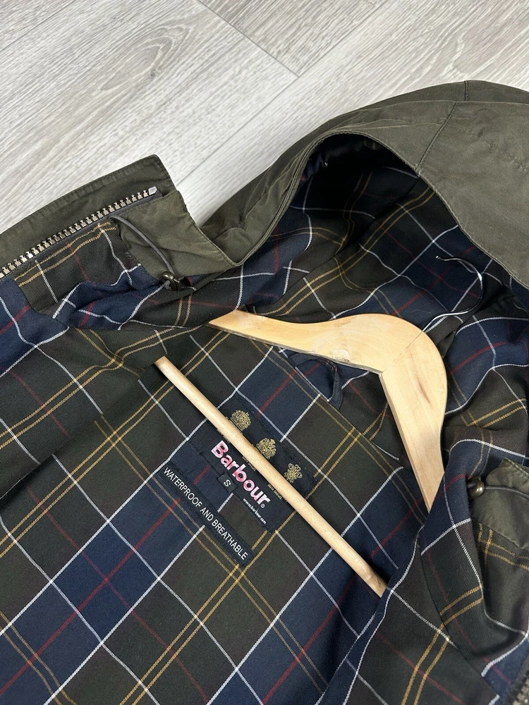 Features: Hooded Department: Men Color: Green Style: Rain Coat Type: Jacket Brand: Barbour Size Type: Regular Size: S Outer Shell Material: cotton and polymide