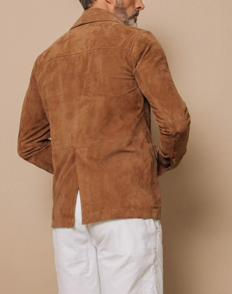 Men's Beige Tan Genuine Suede Pea Coat with 4 Pockets Lambkin Leather Jacket