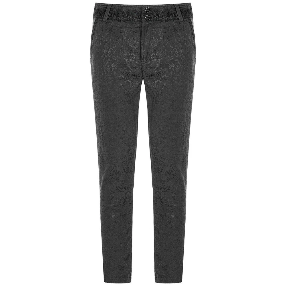 Elevate your wardrobe with these Men's Black Brocade Gothic Regency Dress Pants by Tripp Apparel. Tailored for a regular fit, these medium-sized pants boast a sleek, solid black brocade fabric that ensures both comfort and style. The rayon material offers a smooth finish, perfect for any formal or business occasion. Designed with versatility in mind, the pants feature an adjustable waist, convenient pockets, and a zip and button closure to accommodate your needs. Whether you're dressing up for a wedding or heading to a business meeting, these pants are suitable for a wide range of events, ensuring you look sharp year-round.