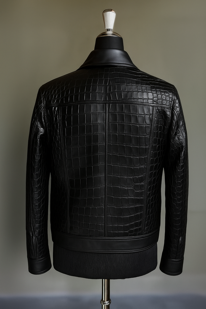 Men’s Black Crocodile Embossed Pattern Leather Jacket Luxury Designer Style