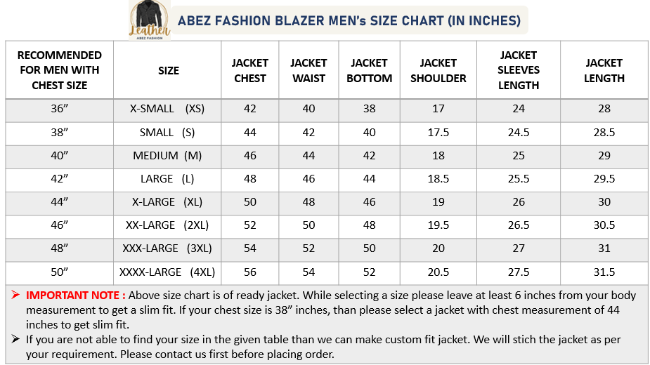 Abez Leather Fashion Item Details Men's Black Leather Blazer Jacket Real Lambskin Two-Button Tailored Suit Coat Upgrade your style with this brand new men's black leather blazer jacket, crafted from soft, genuine lambskin. This two-button coat offers a sleek and sophisticated look, perfect for both formal occasions and smart-casual wear. The high-quality lambskin leather ensures a comfortable, luxurious fit, making this blazer a versatile addition to any wardrobe. - Made from 100% genuine soft lambskin leather for a premium feel - Classic two-button blazer design, perfect for formal and casual events - Sleek black color for a timeless, elegant appearance - Tailored fit for a refined silhouette and modern style - Durable and comfortable, suitable for year-round wear Enhance your wardrobe with this stylish and versatile lambskin leather blazer—brand new and available in all sizes! Size and Color Consult the provided size chart in the image to ensure a perfect fit. Follow the instructions for accurate measurements. Unsure about sizing? Send us a message with your body measurements, and we'll tailor your jacket accordingly. Enjoy our FREE CUSTOMIZATION service to meet your specific requirements; simply get in touch with us. Explore a variety of COLORS by contacting us for your preferred choice. Customize / Tailor Made Leather jacket for Men & Women in Sheep / Lamb antique leather jacket Customize your order to meet your specific requirements. Dear Customer, Please answer the below questions in order to serve you better : Shoulder = Chest = Arms = Waist = Sleeves = Tummy = Length of jacket = HIP = Actual height = Fitting = slim and regular We also accept bulk orders Shipping Information Color of actual product may vary due to photography/light effects & also due to computer screen resolution and color settings. Buyer will bear custom-duty/Import duty charges. Orders are shipped using DHL or FedEx, occasionally utilizing India Post based on location and service accessibility. The Accessories of the Leather item such as Button, Zippers, & color might differ due to material availability in the market but we use Premium Quality only. Return Policy If you find that product is not as per product detail, we will accept a return for Item within 30 days of receiving item in original condition as it was sent and we will refund you EXCLUDING shipping charges. Buyer is responsible for return shipping & handling charges. A request you to Please don't leave negative or neutral feedback, if any problem with the product, you should contact us first and also don't open a case, first contact us we will fully help the buyer to resolve their problem. THANK YOU