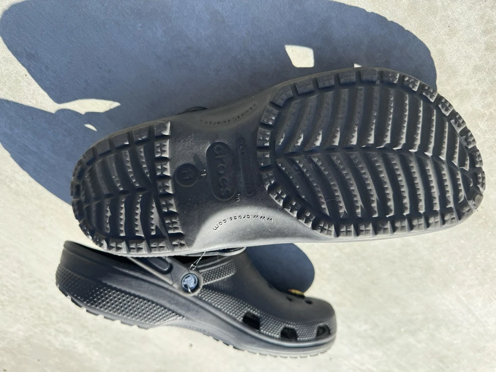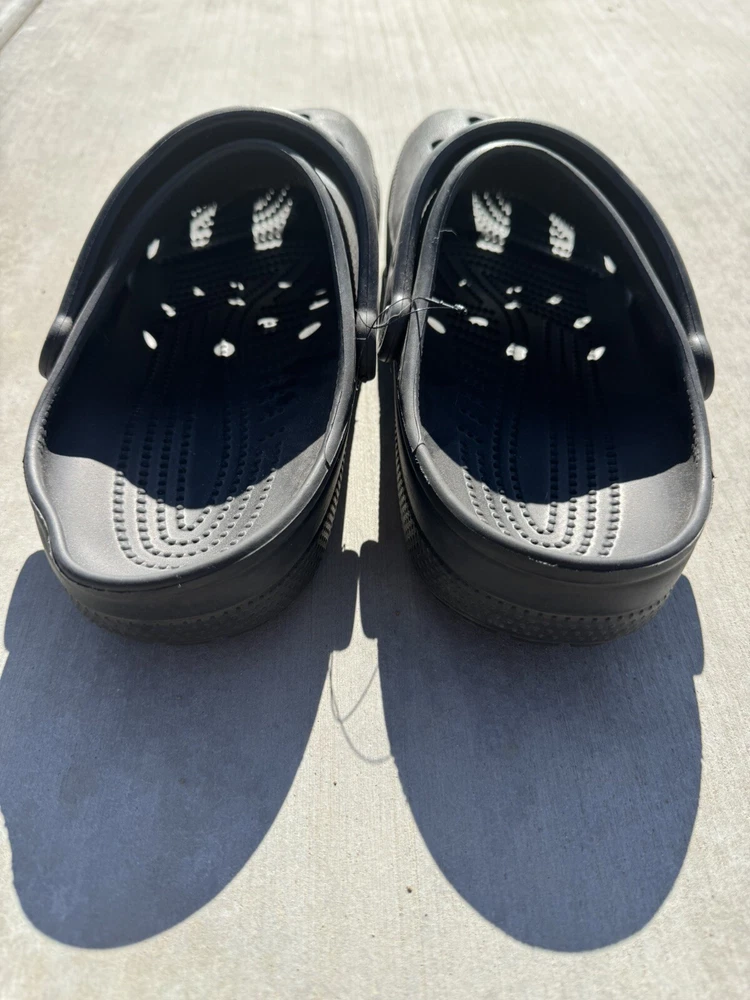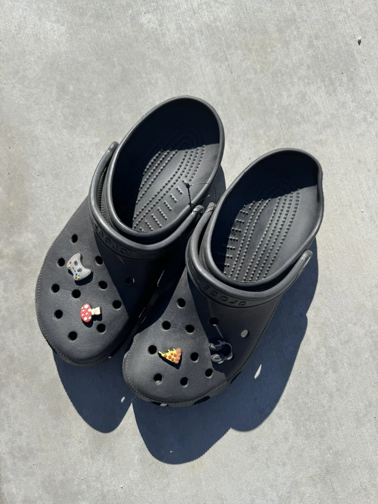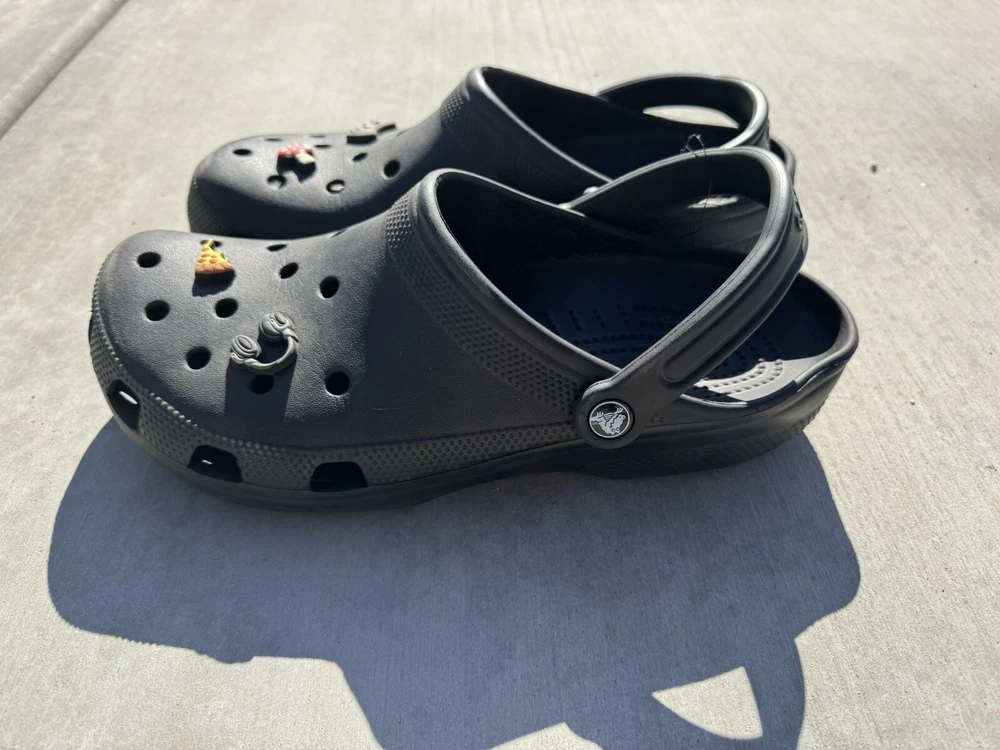 You’re looking at a pair of men’s black crocs. These crocs are a size 11 men’s come with four charms featuring a pizza charm a game controller, charm, headphone, charm, and a mushroom charm. NOTE: the left croc on the heel is a little bent, but will relax after use. These crocs were barely worn. They are in great condition. There is some signs of wear. All sales are final All items come from a smoke and pet free environment Shipping for this item is only $8.99 ( love to combine by shipping ) If you have any questions, please feel free to ask thank you for looking and happy bidding
