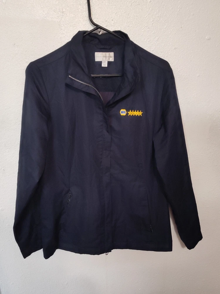 Style: Windbreaker Type: Jacket Outer Shell Material: Cotton Color: Black Closure: Zip Size Type: Regular Department: Men Accents: Embroidered, Logo Features: Collared, Full Zip, Pockets Season: Winter, Fall, Spring, Summer Brand: Unbranded Size: M