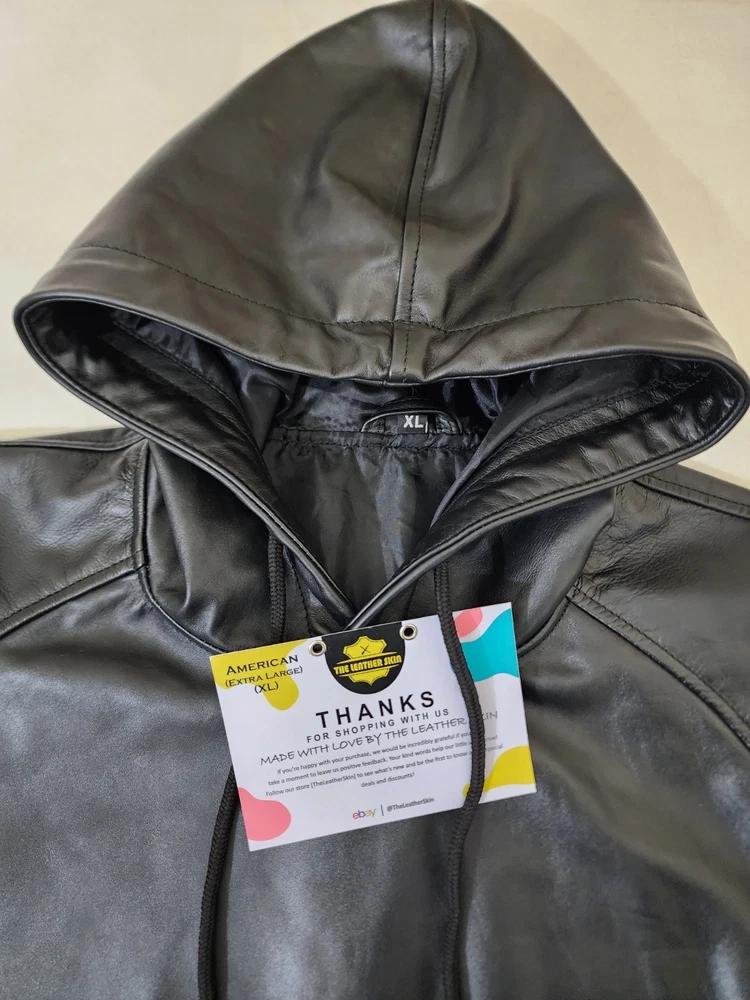 The Mem's Black Premium Leather Hoodie is a handmade genuine lambskin leather jacket that exudes classic style and sophistication. This solid black hoodie features a hooded accents and a classic closure, making it a versatile and breathable garment perfect for winter and spring seasons. With a size range from XS to 5XL, this pullover hoodie is designed for men who appreciate quality craftsmanship and timeless style. Ideal for riding, walking, or everyday wear, this leather hoodie from Pakistan is a must-have addition to any wardrobe.