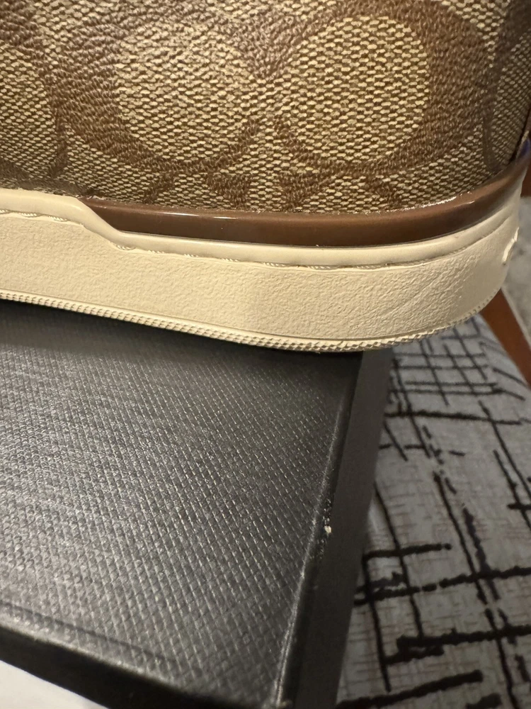 Mens COACH Signature Logo Coated Canvas Low Top G4949 Sneaker/ Shoe (Khaki/Saddle) Size 11.5 Coach Signature Logo Coated Canvas Sneakers DESCRIPTION Named for the bustling trail on New York City's West Side, our High Line sneaker combines sophisticated good looks with maximum comfort. Crafted of our Signature Logo print coated canvas and smooth leather, the low-top silhouette features a comfortable cushioned insole and a lightweight EVA outsole. feature: * Signature coated canvas and leather upper * Lace-up closure * Fabric lining and footbed * EVA outsole