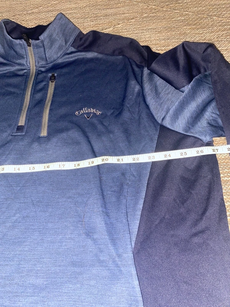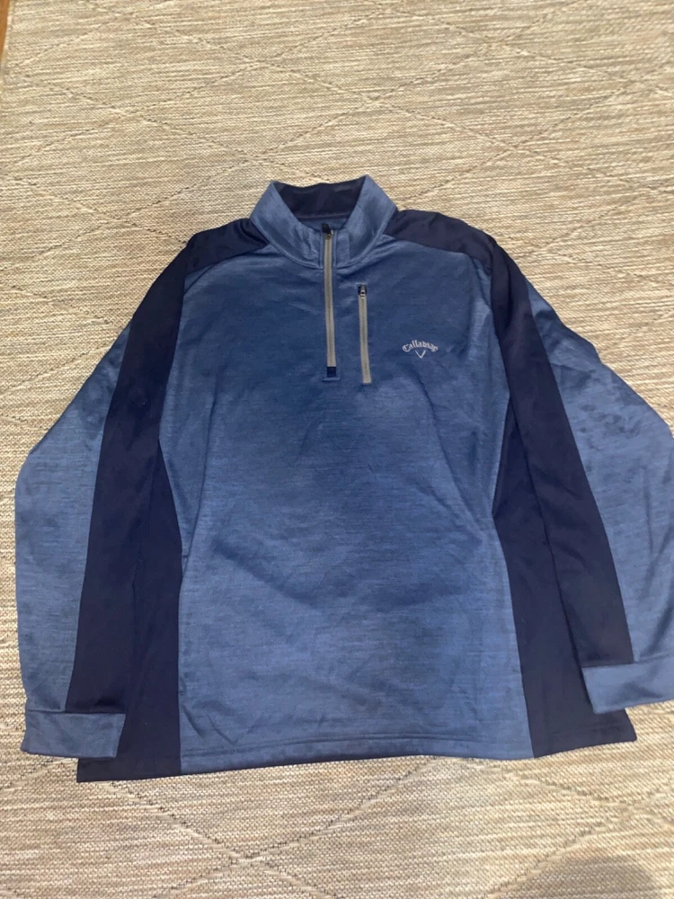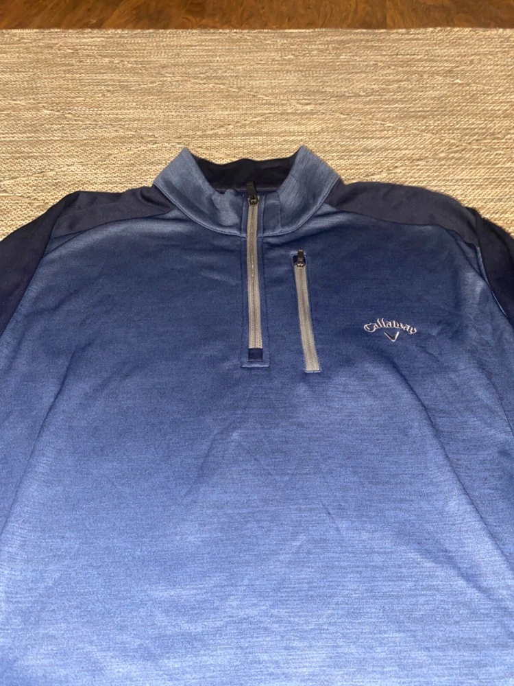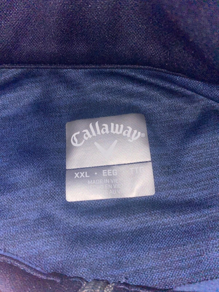 This is a Men's Callaway Golf 1/4 Zip Fleece-lined Pullover in size XXL. It features a solid navy/heather blue color, long sleeves, mock neck, and a zipper closure. Made of 100% polyester fleece, it offers UPF50 sun protection. The pullover is designed for activewear, specifically for golf, and is machine washable. It is branded by Callaway and has a logo accent on the zipper.