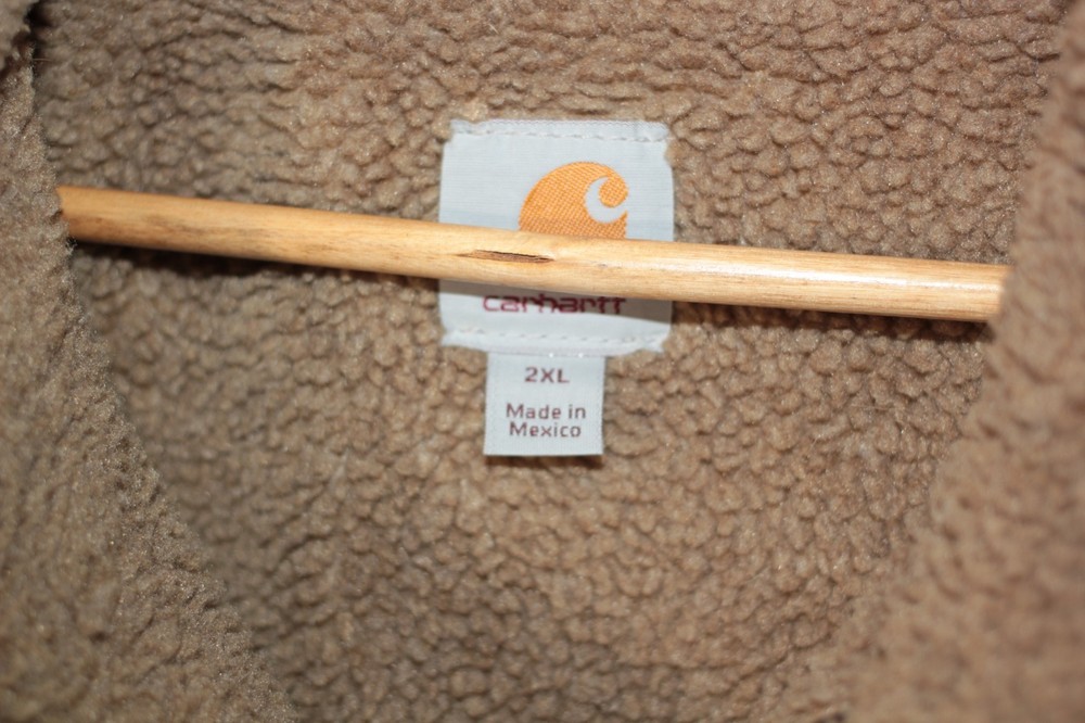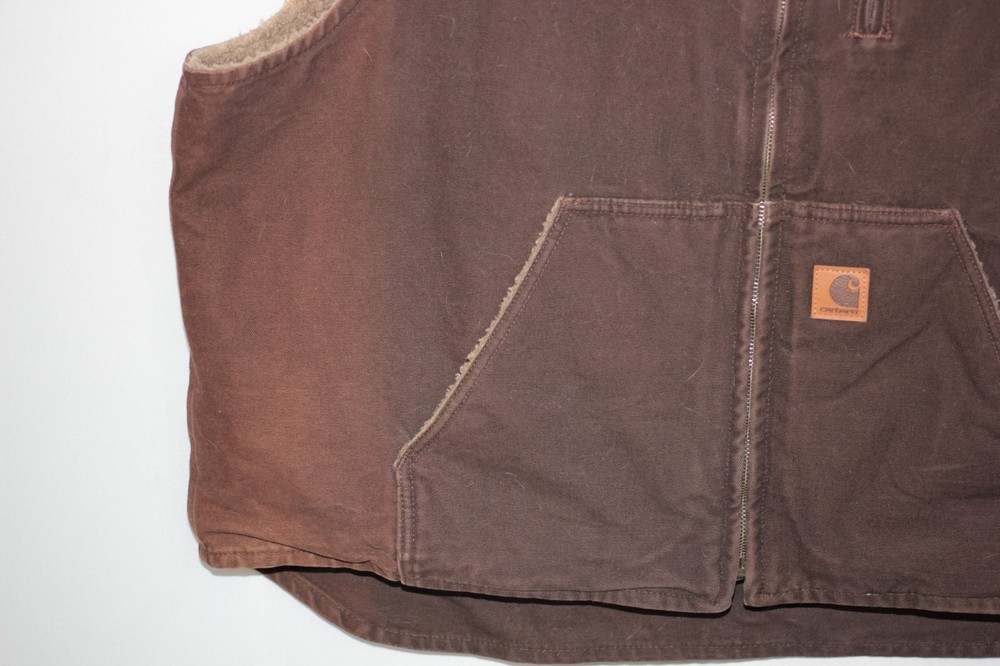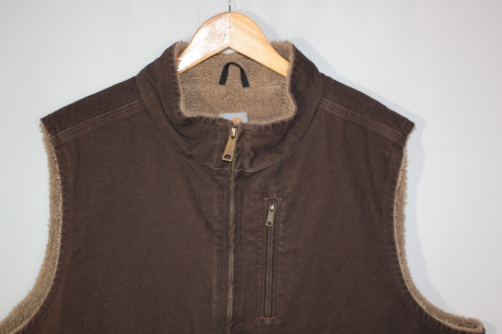 The Mens Carhartt faded Brown Full-Zip Canvas workwear vest is a classic and durable piece perfect for rugged outdoor work. Made from sturdy canvas material with a comfortable polyester lining, this vest features a full zip for easy layering. The biker style and rugged design make it a versatile and stylish addition to any man's wardrobe, suitable for tough work environments or casual outings. With the iconic Carhartt brand and a size 2XL, this vest is a timeless piece that embodies American quality and craftsmanship. has fading throughout the vest as shown in pics. p2pXt2b 27X25